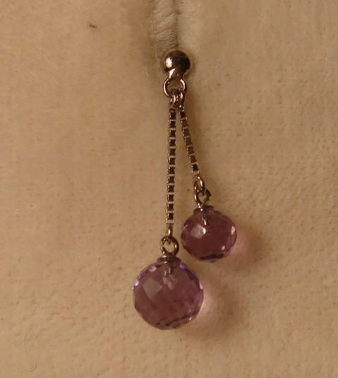 立体的に、ミラーボールのようにカットされた大小2つのアメジストが耳元で可愛く揺れます。