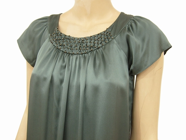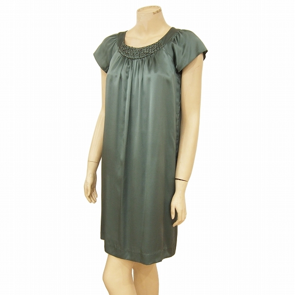 UM美品★シップス*SHIPS★緑系★高級シルク(絹)100%★ビジュー★美艶ワンピース★M相当★パーティー*結婚式などにも