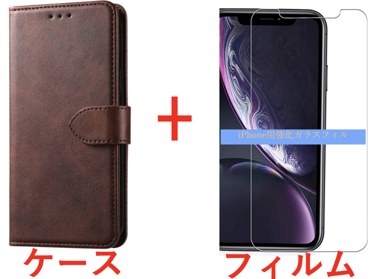 ケース+フィルム【セット】iPhone 12ProMax用(PUレザー 茶色 手帳型 耐衝撃 ブラウン)(強化ガラスフィルム 3D Touch対応 9H)送料無料