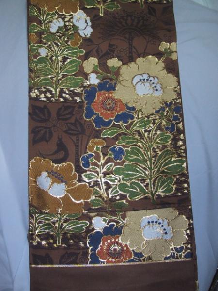 おもに訪問着(おしゃれ向き)用6通柄袋帯です じゅらく 『。。。』ブランド 西陣 絹100%金属糸等使用   新品み仕立て品  茶地。