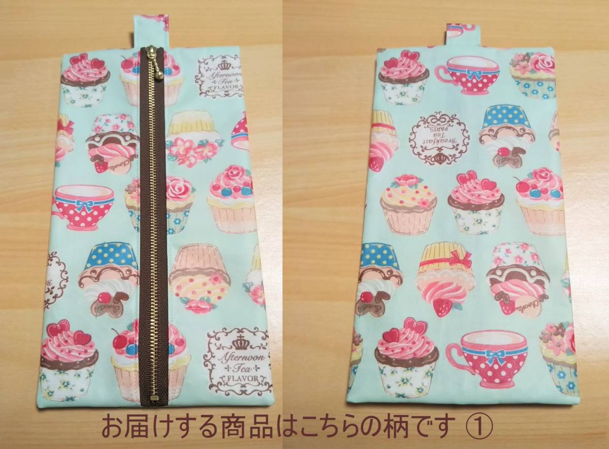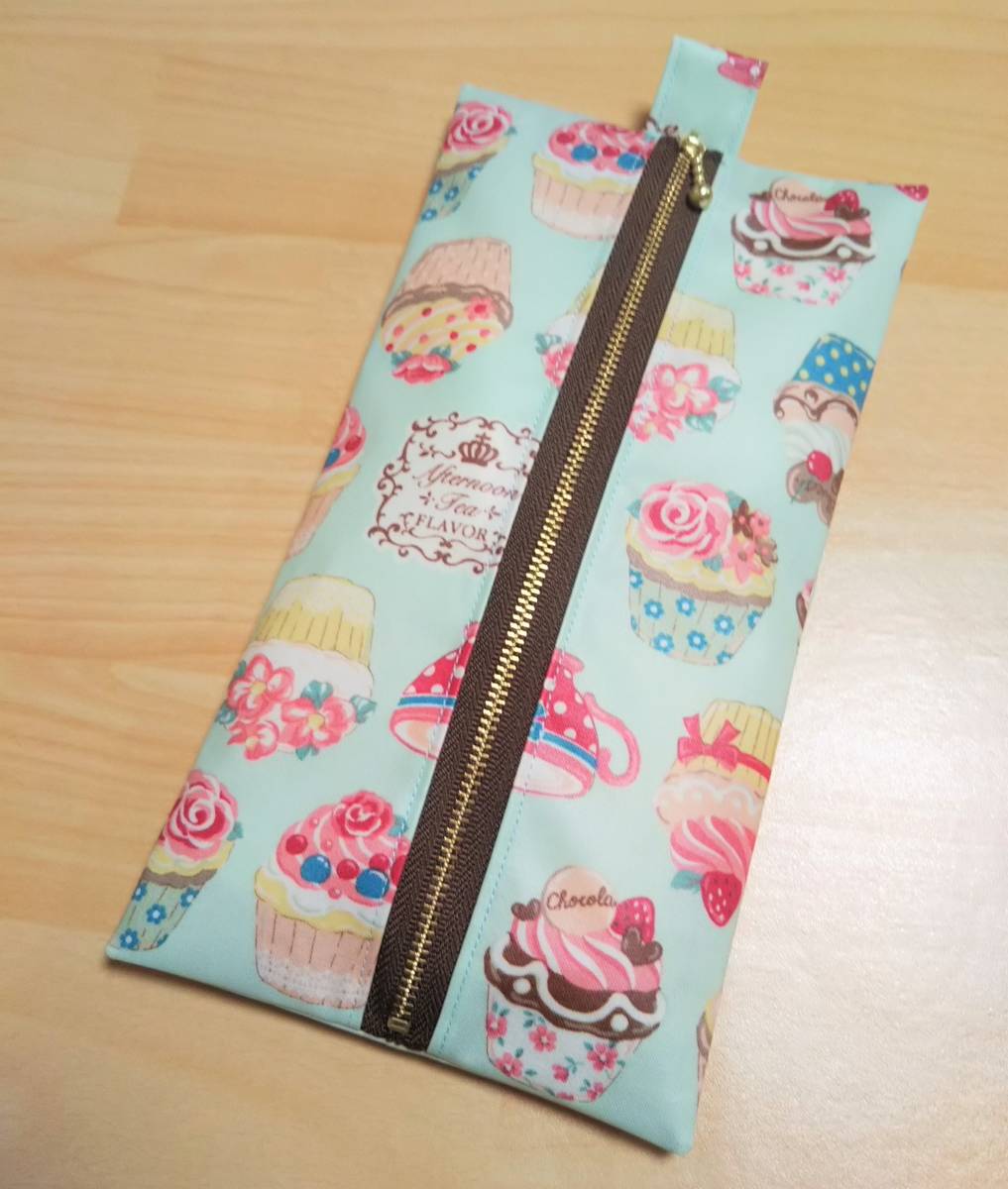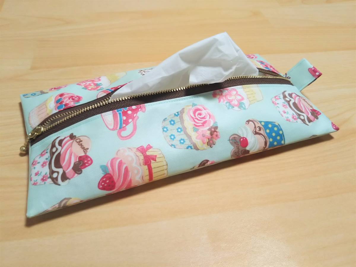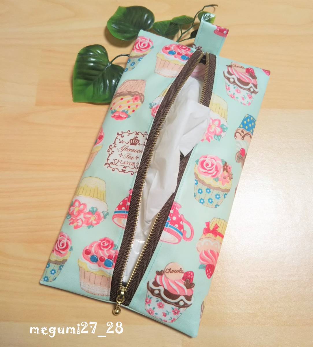 <ティッシュケース(ファスナー)>ミニョンケーキ柄ミントグリーン◆花粉症◆ハンドメイド◆ラミネート加工
