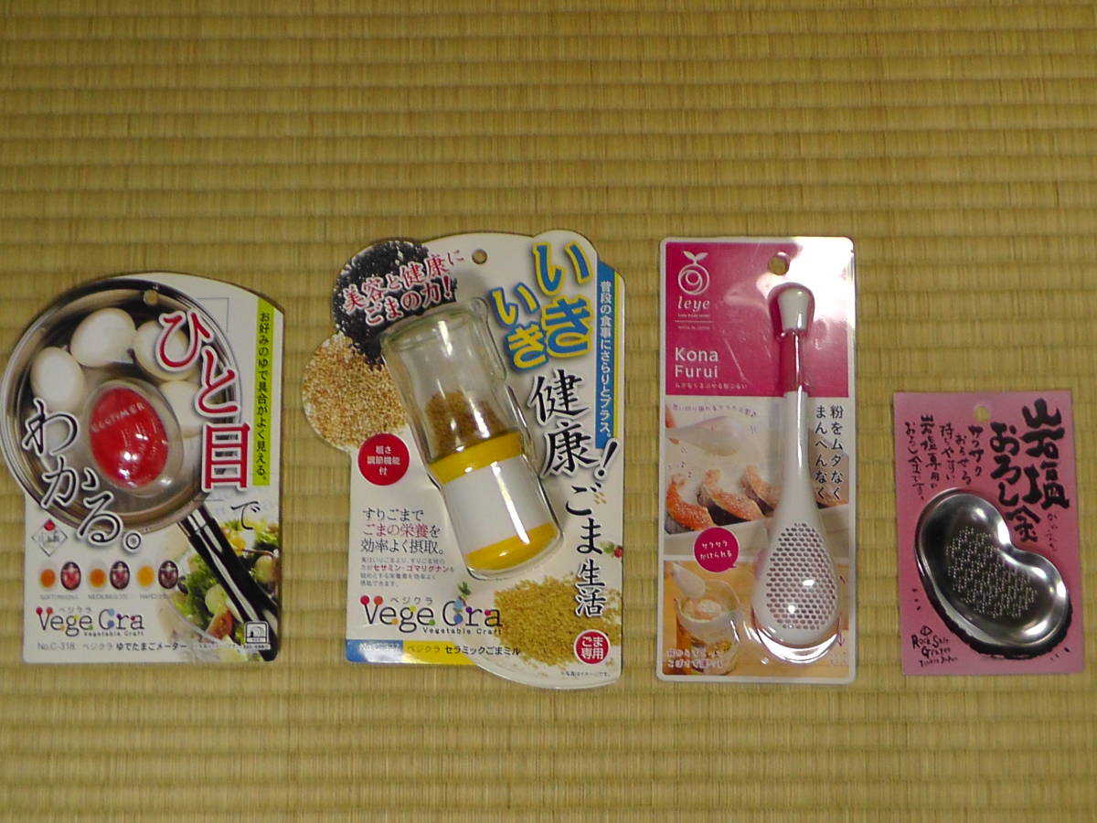 型番:ベジクラ/ゆでたまごメーター(C-318) セラミックごまミル(C-327) ・ オークス(LS1534) ・ 岩塩おろし金(C-9664)