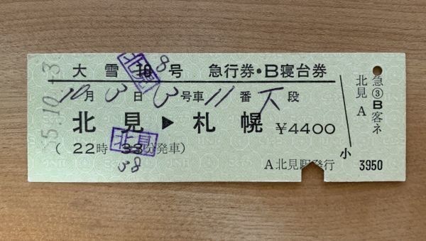 硬券 202 完全常備券 急行券・B寝台券 北見→札幌 北見駅発行 昭和55年 NO.0036