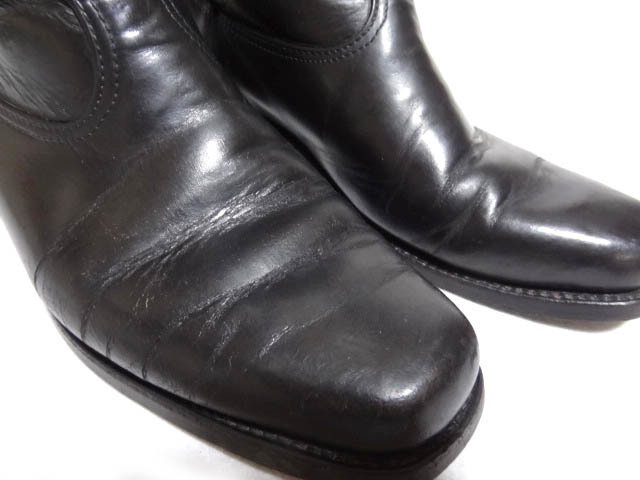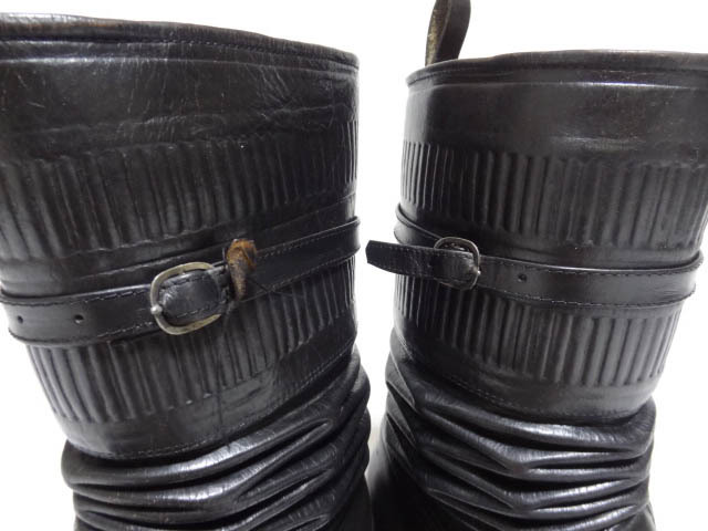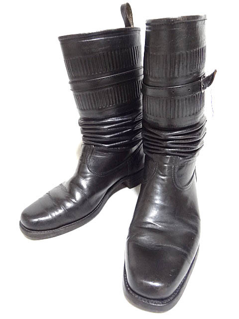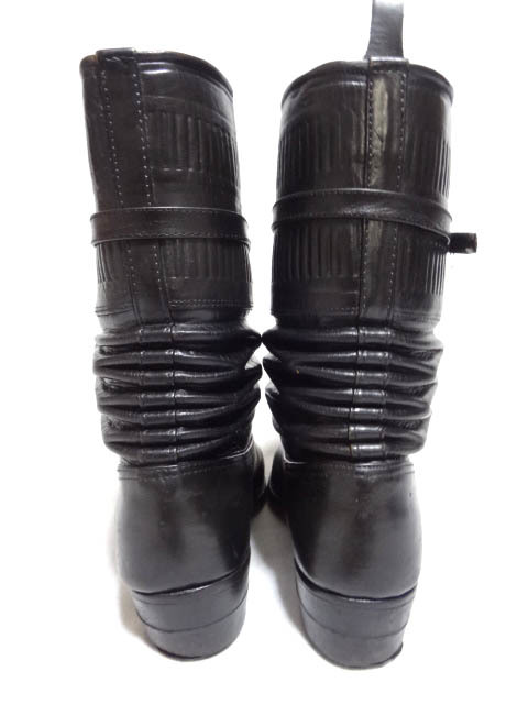 ビンテージ 希少 50S レザー 蛇腹 加工 ロング ブーツ 黒 ブラック スクエア トゥ 革 ロカビリー デザイナーズ レア 珍品 靴 シューズ 皺