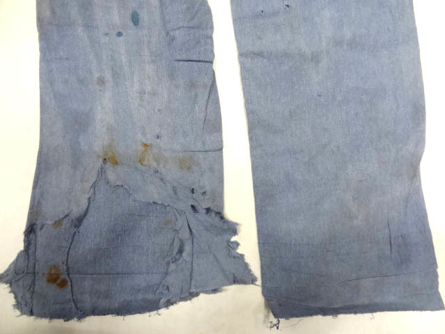 希少なナス紺が褪せたようなレアなブルー系シャンブレーカラーです。いくら時間とお金をかけようが見つからないと思います。画像の通りかなり履きこまれたアジのある一本です。リペアもされているので着用には問題はありません。レングスが稀なくらい長めに残っているので破れた箇所は詰めてきれいに処理できるだけの長さがあります。ダメージをマイナス要素としては全く考えていませんので共感できる方のみご検討ください