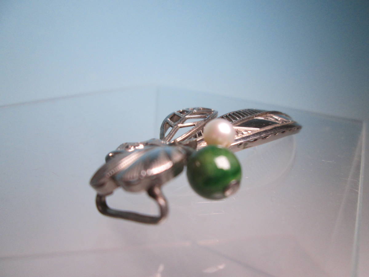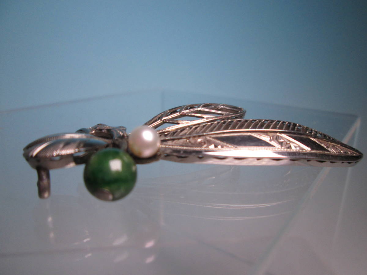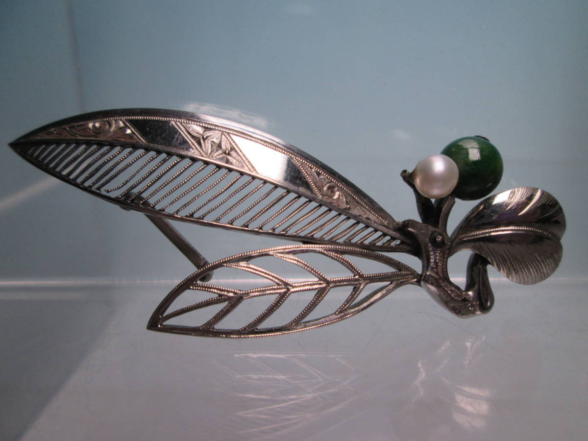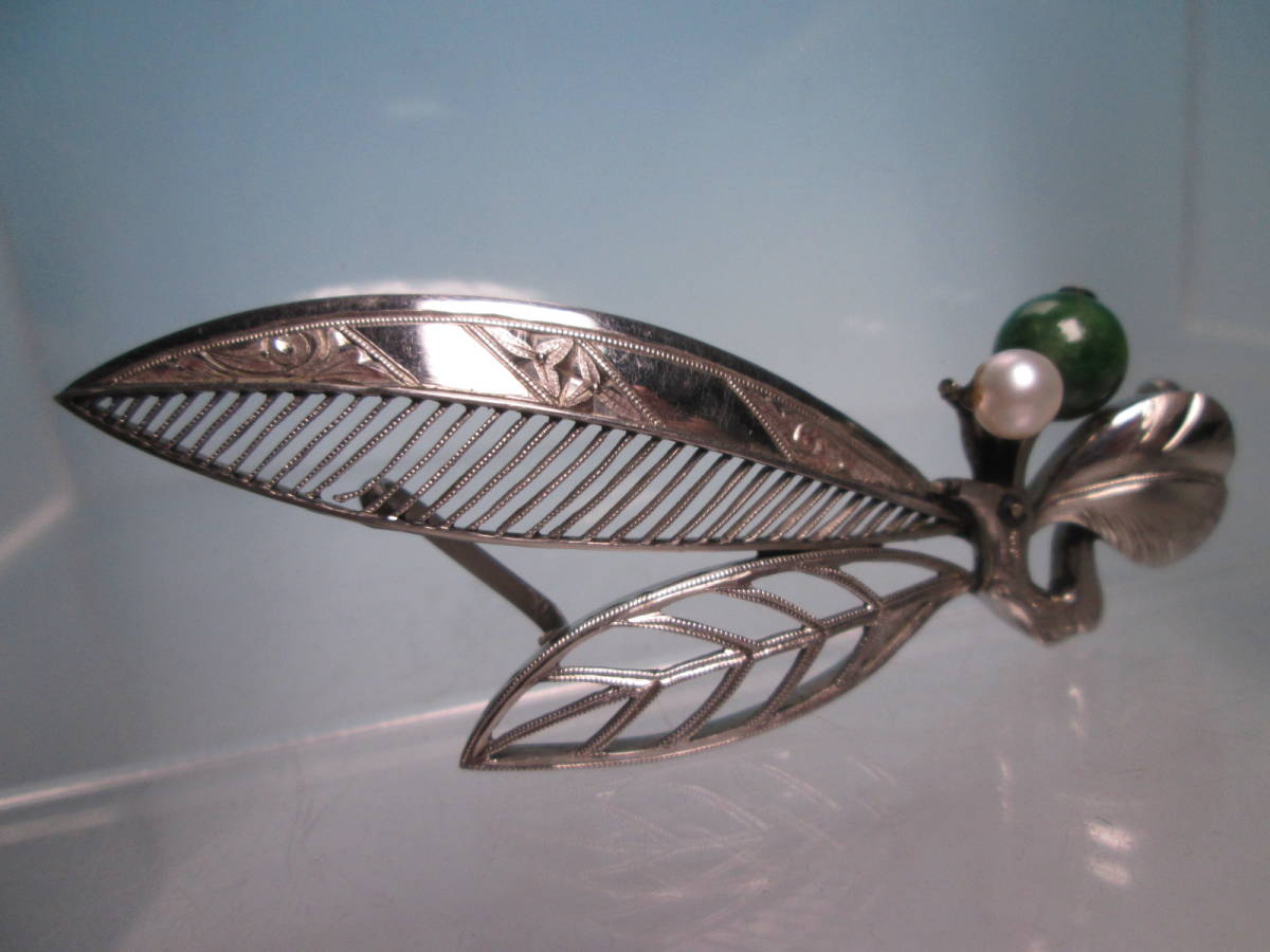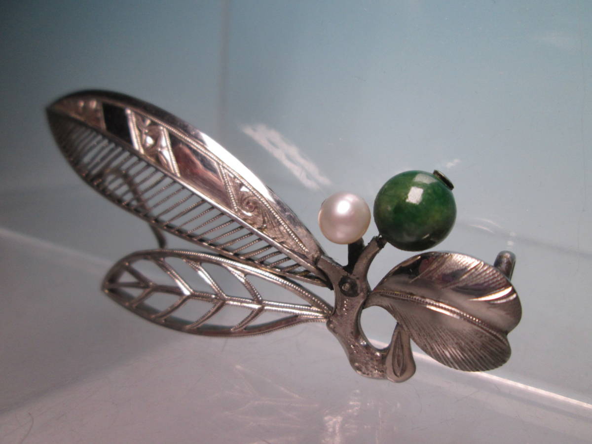 【江月】アンティーク・彫金細工 本翡翠玉&真珠飾り葉と実帯留め 7,79g