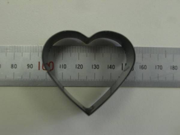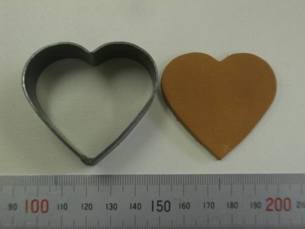 裁断用抜型 ハート用 サイズは幅が、50mm、、高さは47mmです。刃型の高さは23.6mmです。画像の革は試し抜きしたものです。商品は、画像の抜型のみです。