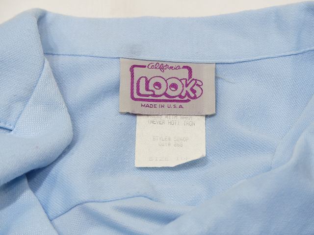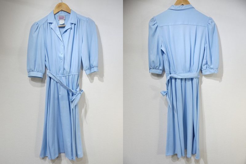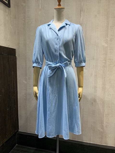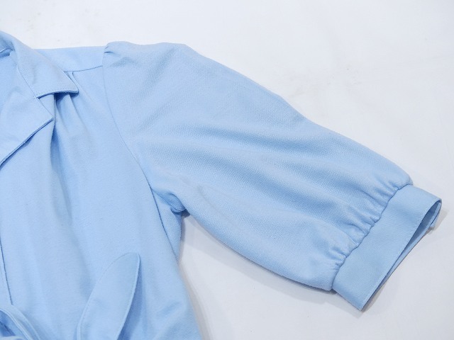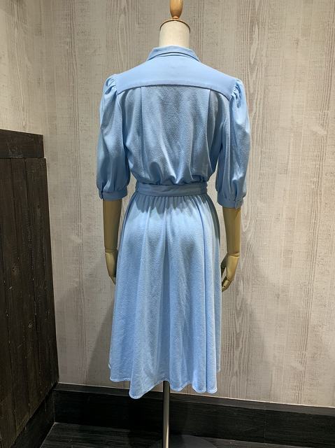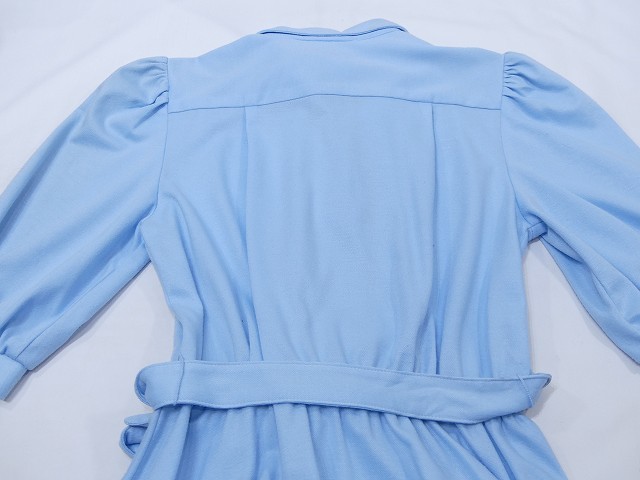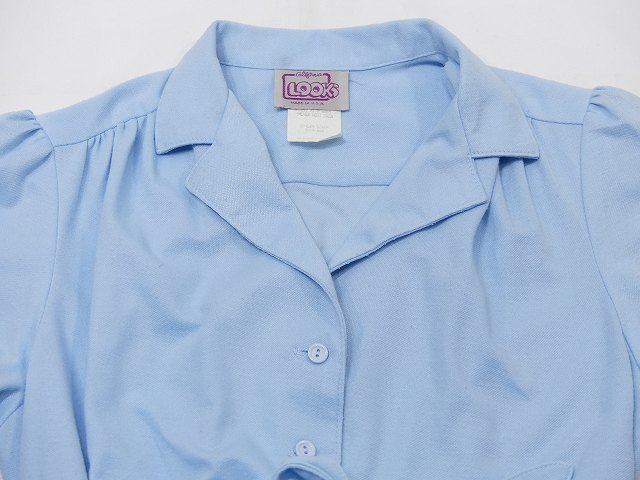 USA製 70s 80s LOOKS ギャザースリーブ オープンカラー ペールトーン 水色 ライト サックス ブルー ミモレ丈 ワンピース ドレス ビンテージ | |||