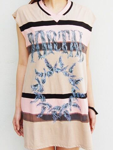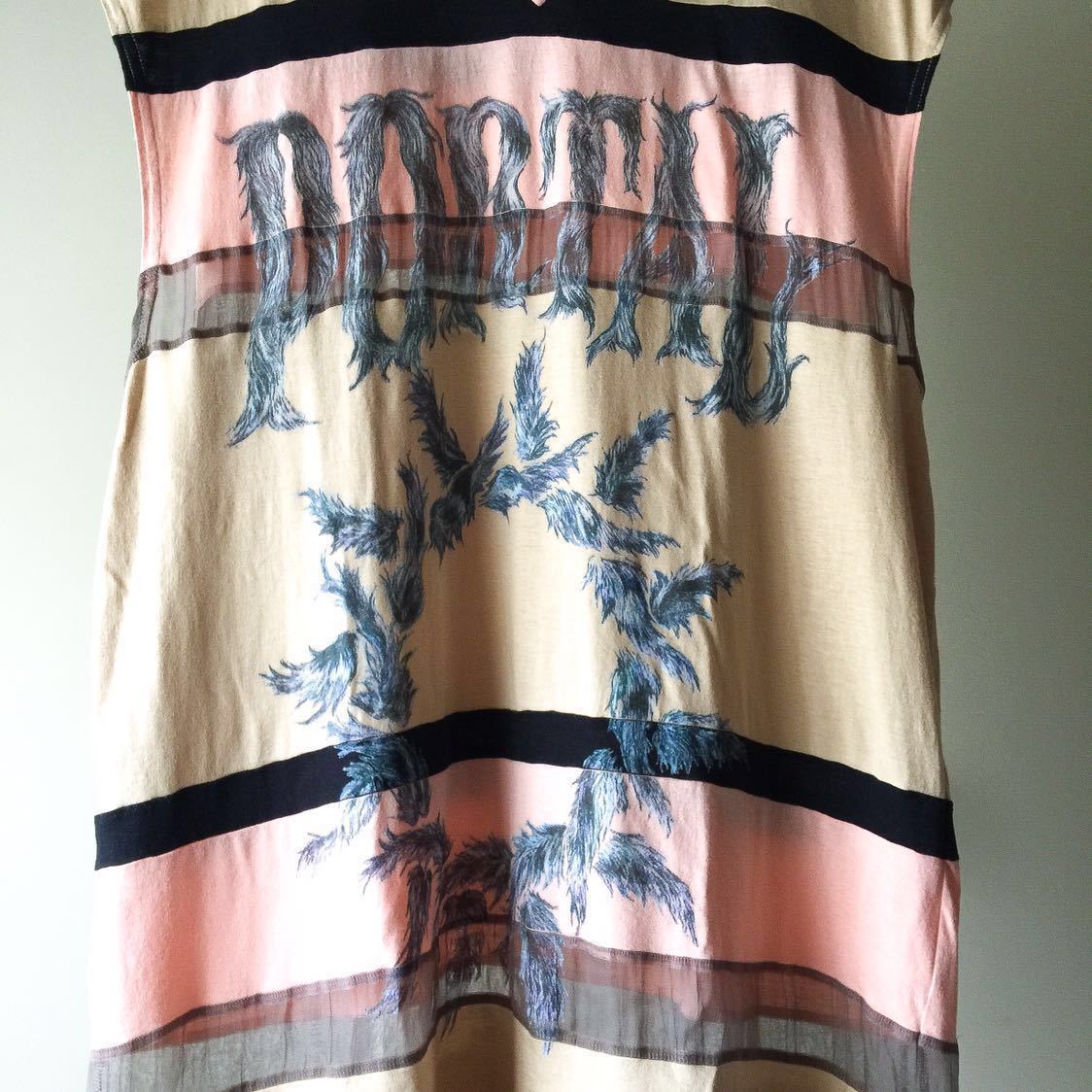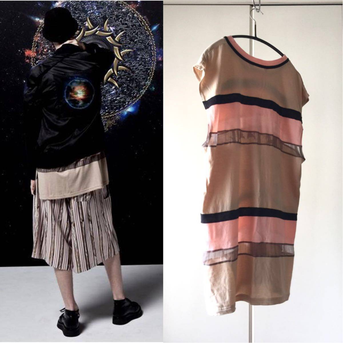 カットソー、ニットソー、オーガンジーで切替られたロングタンクトップス。