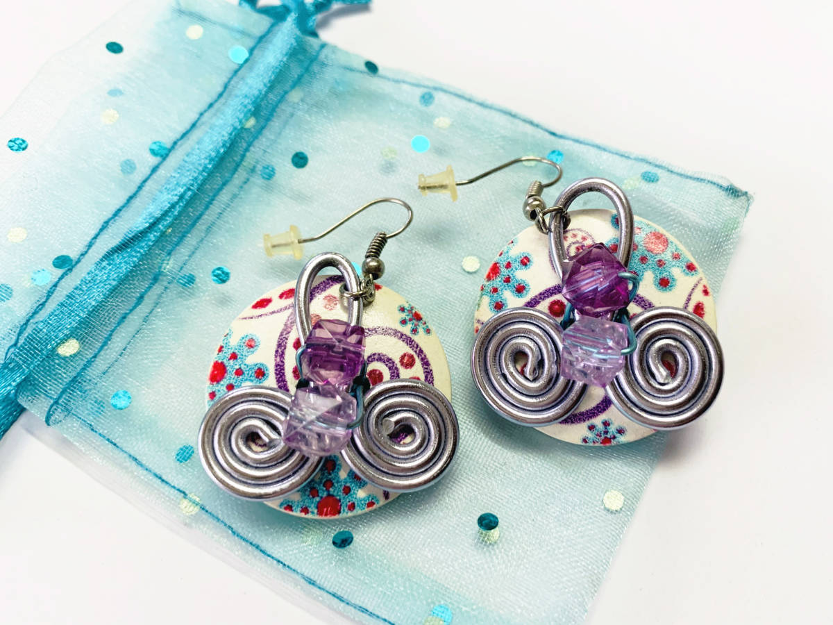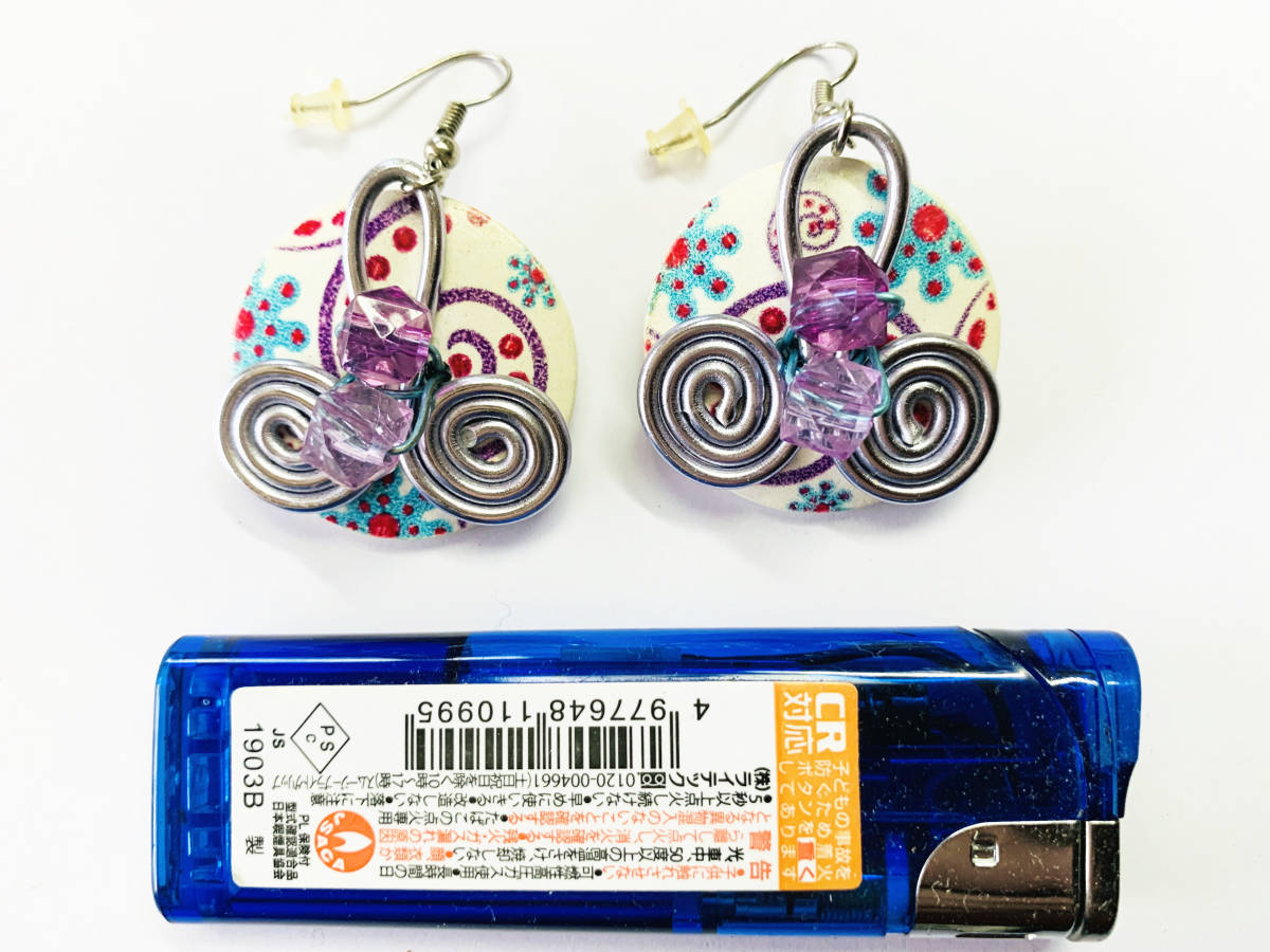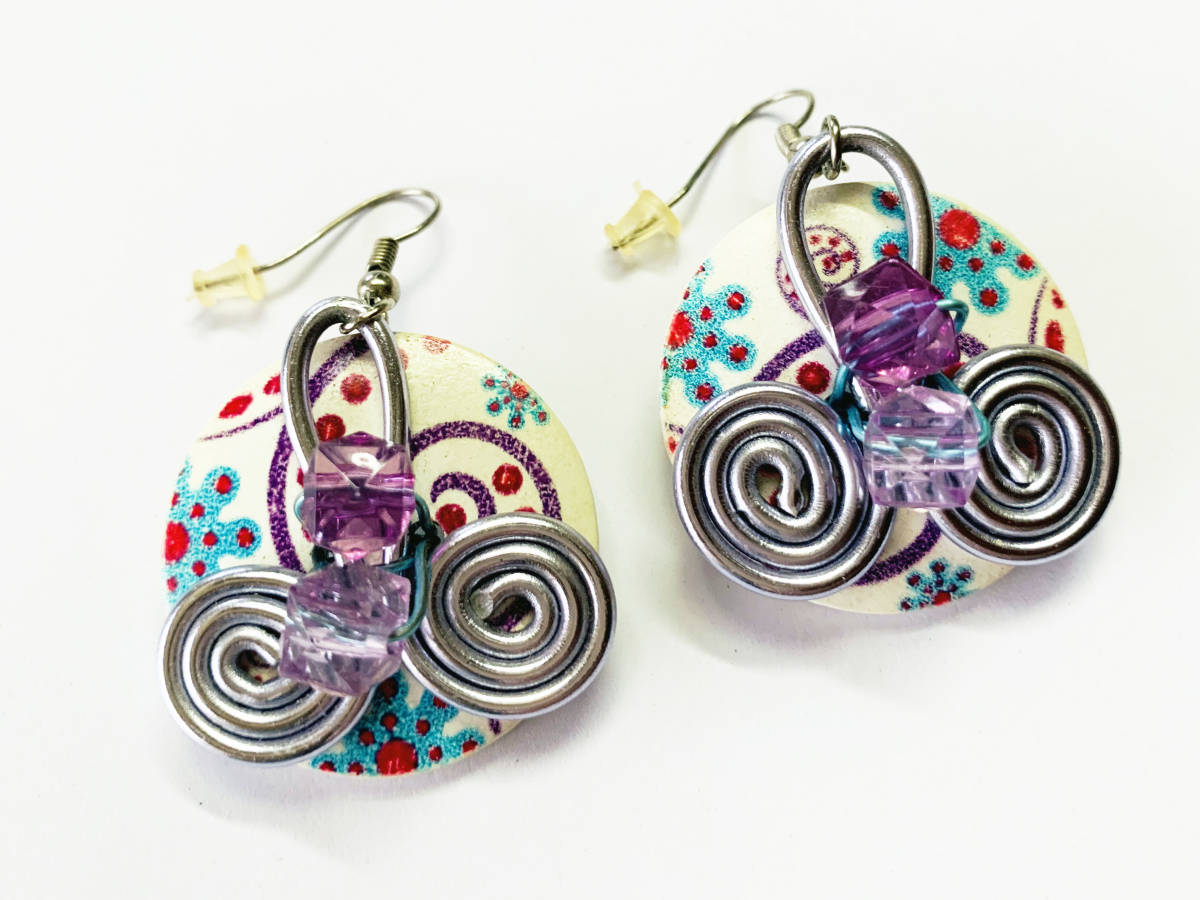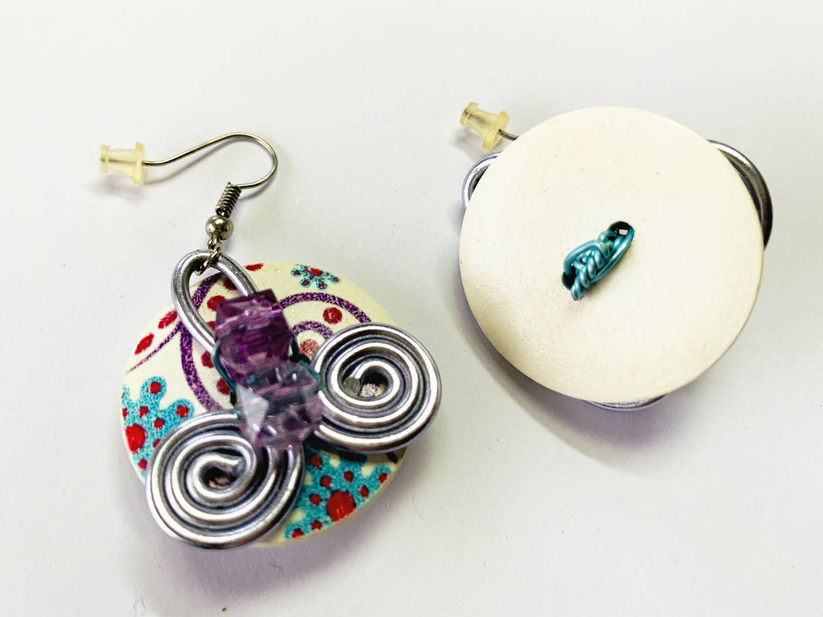 手作りのピアス、かわいいペイントが入った大きなボタンをベースにバイオレット系のビーズをあしらい、ポップなピアスに