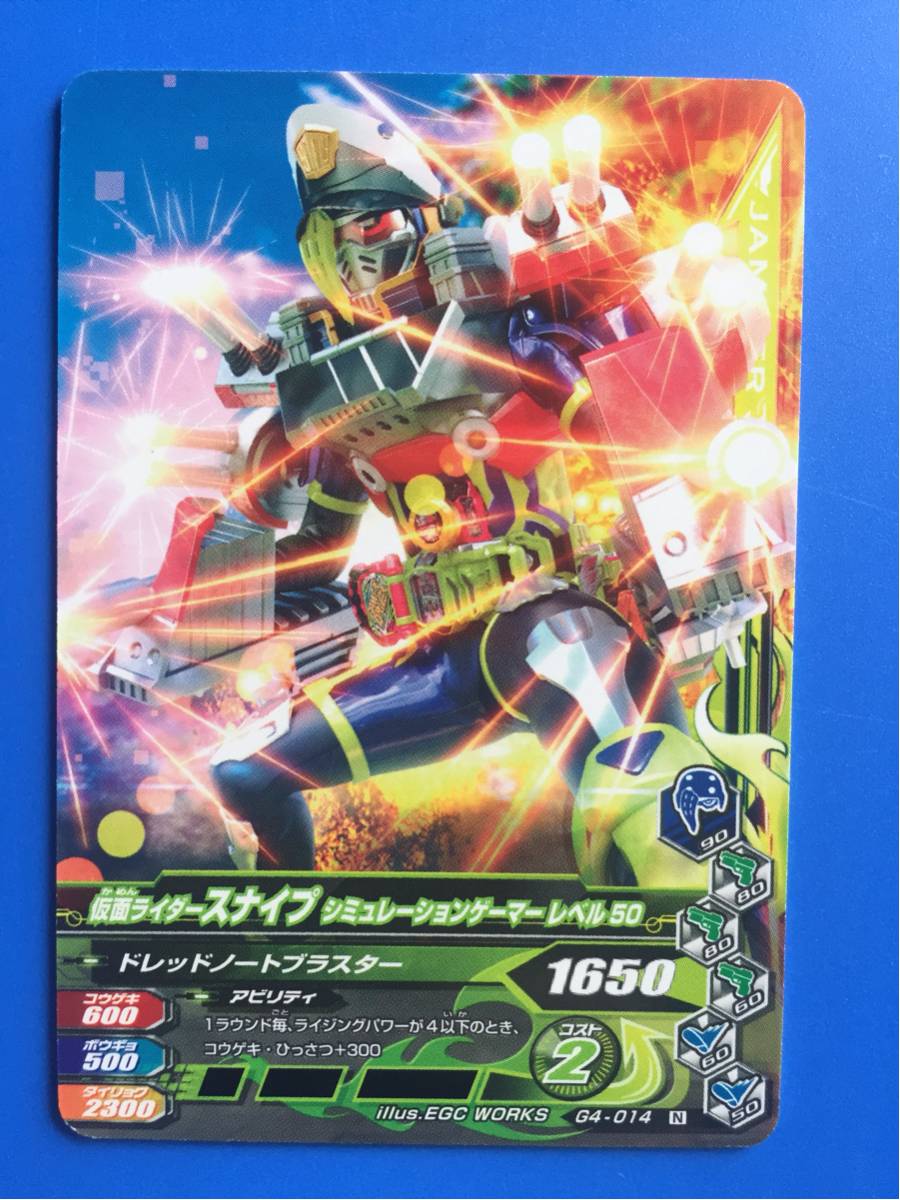 仮面ライダー、ガンバライジング・第G4弾からNo.014《仮面ライダースナイプ・シミュレーションゲーマーレベル50》の登場です。発送は、普通郵便を利用します。(特にご希望のない場合)おとりまとめも可能ですが、送料に変動する場合がございます。また、送料のご請求は、自宅での計量を基準にご請求させていただいておりますので、実際の金額と差異が出る場合もございます。予めご了承ください。他にも多数出品中です。まとめてこの機会にいかがでしょうか?ご質問お待ちしております。