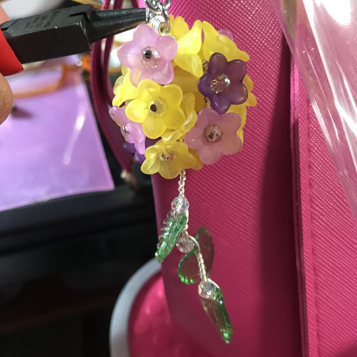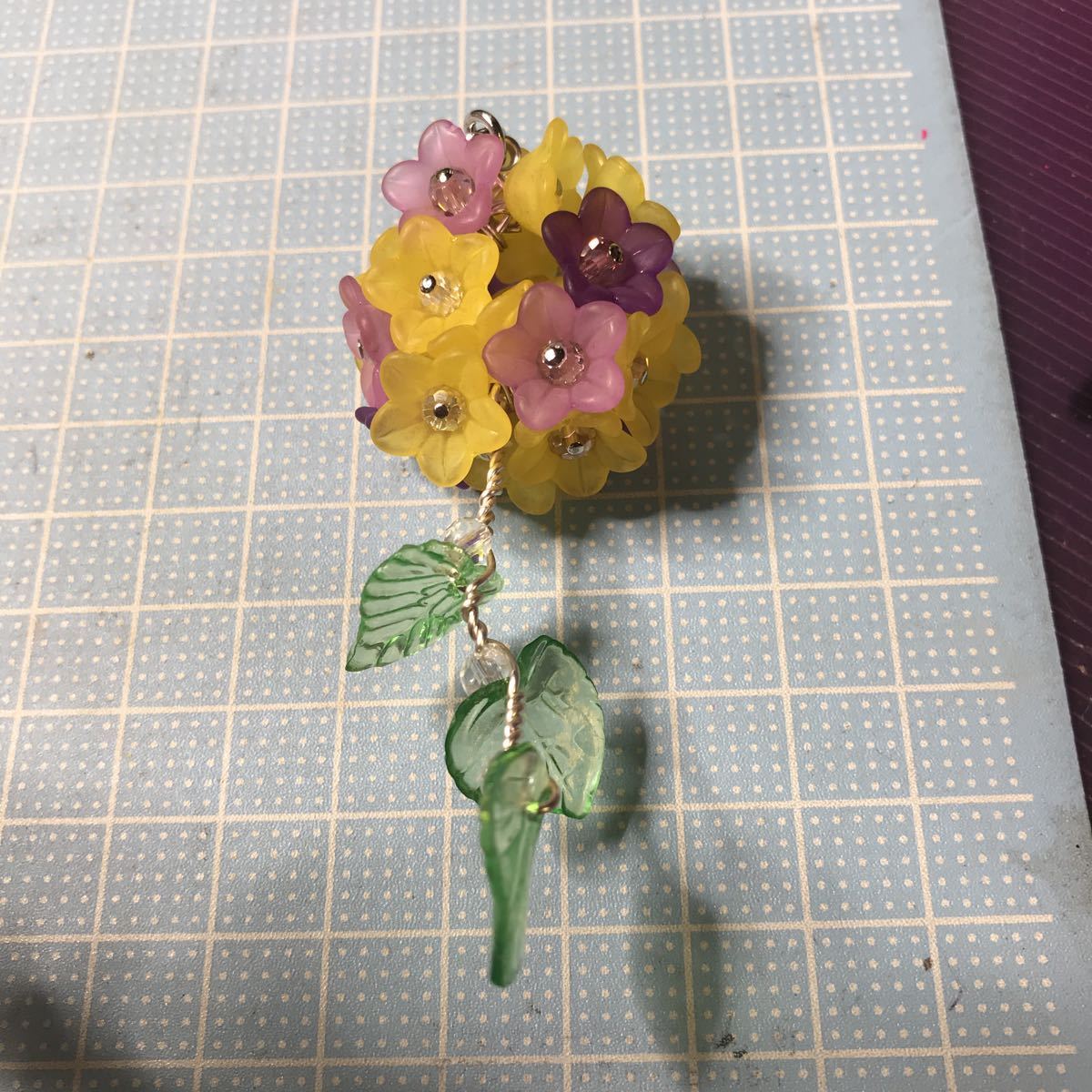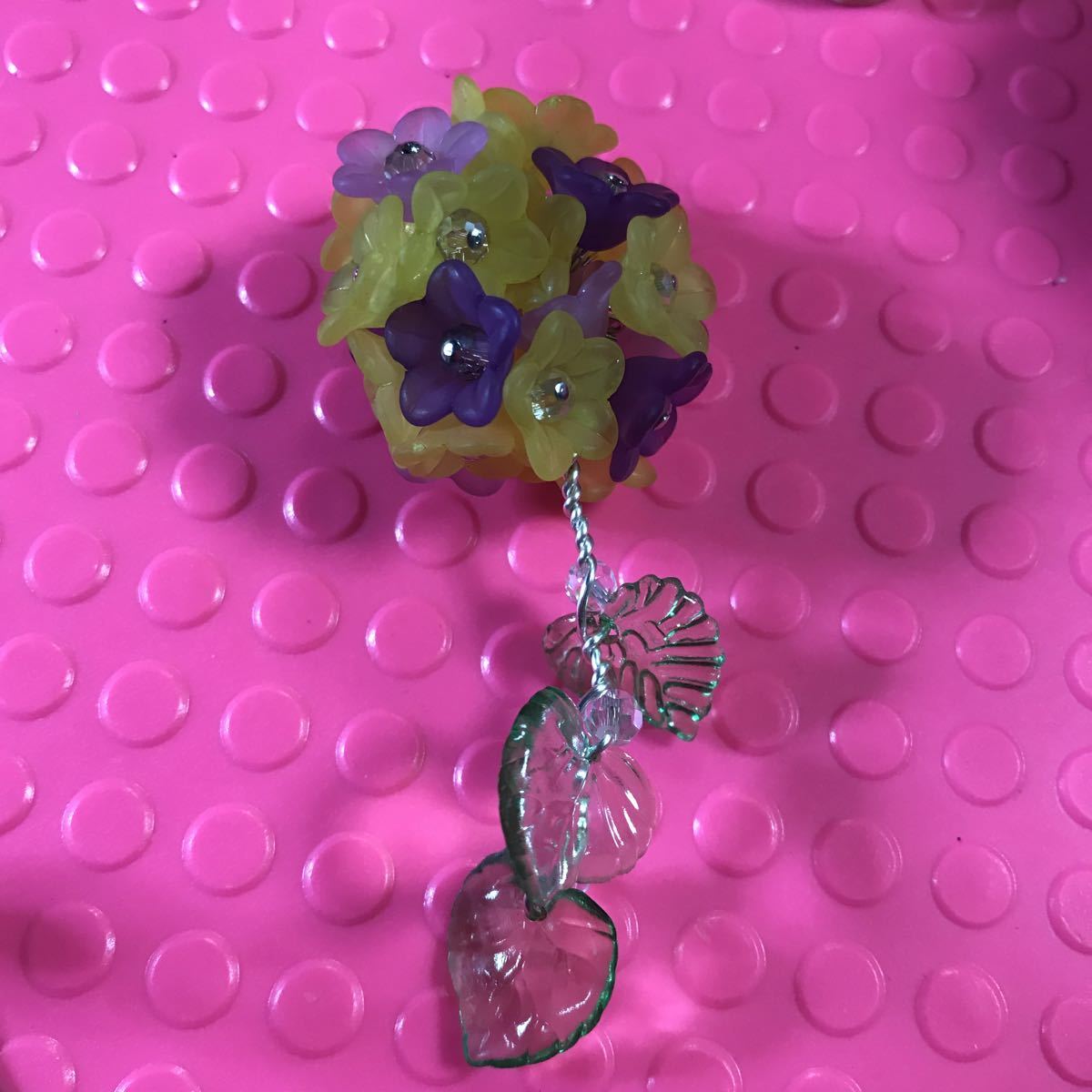 可愛い小さなお花を24個繋げてつくりました。お花の芯はキラキラカットガラス使用しているのでとても綺麗です、葉っぱにもカットガラスつけたので濡れたように見えて綺麗です