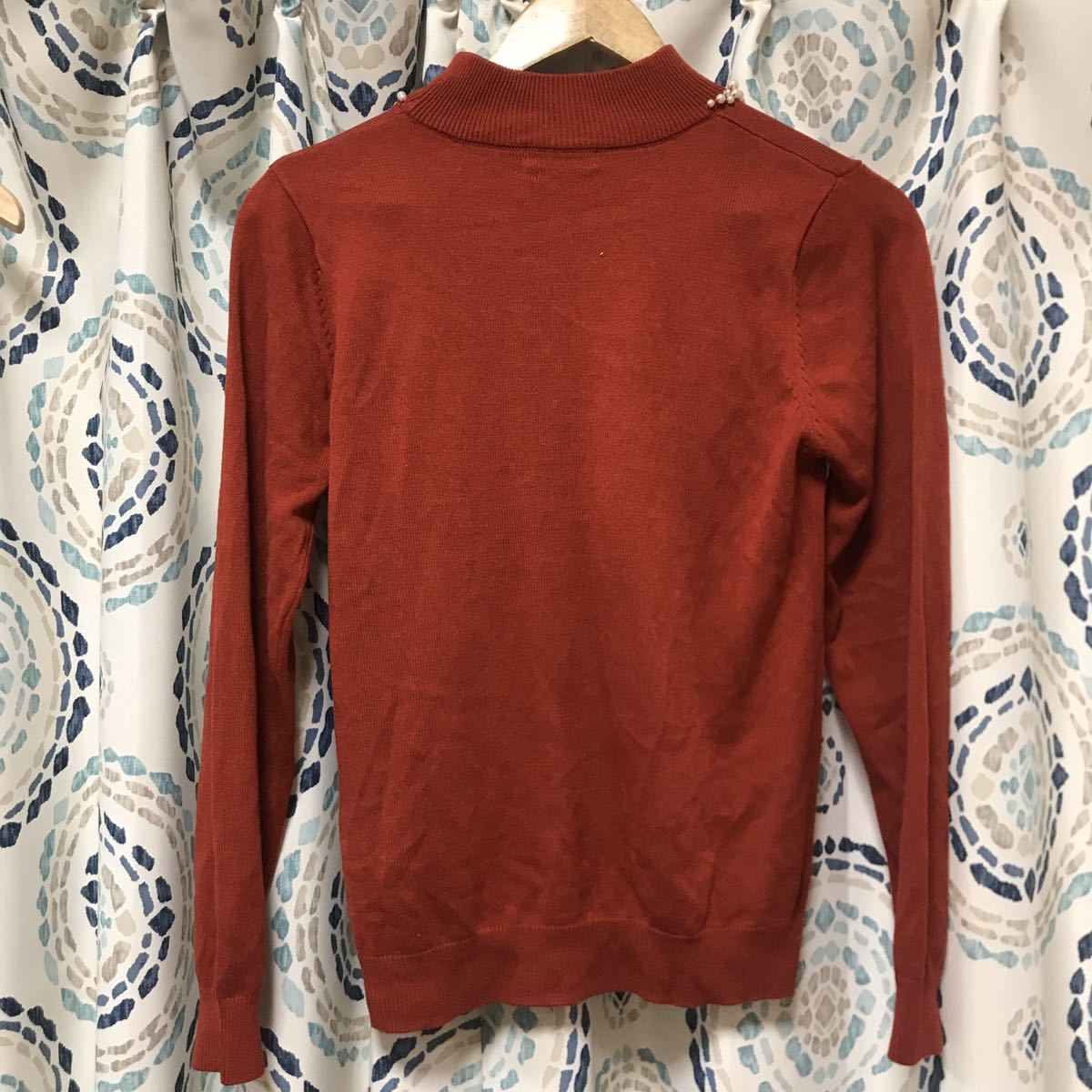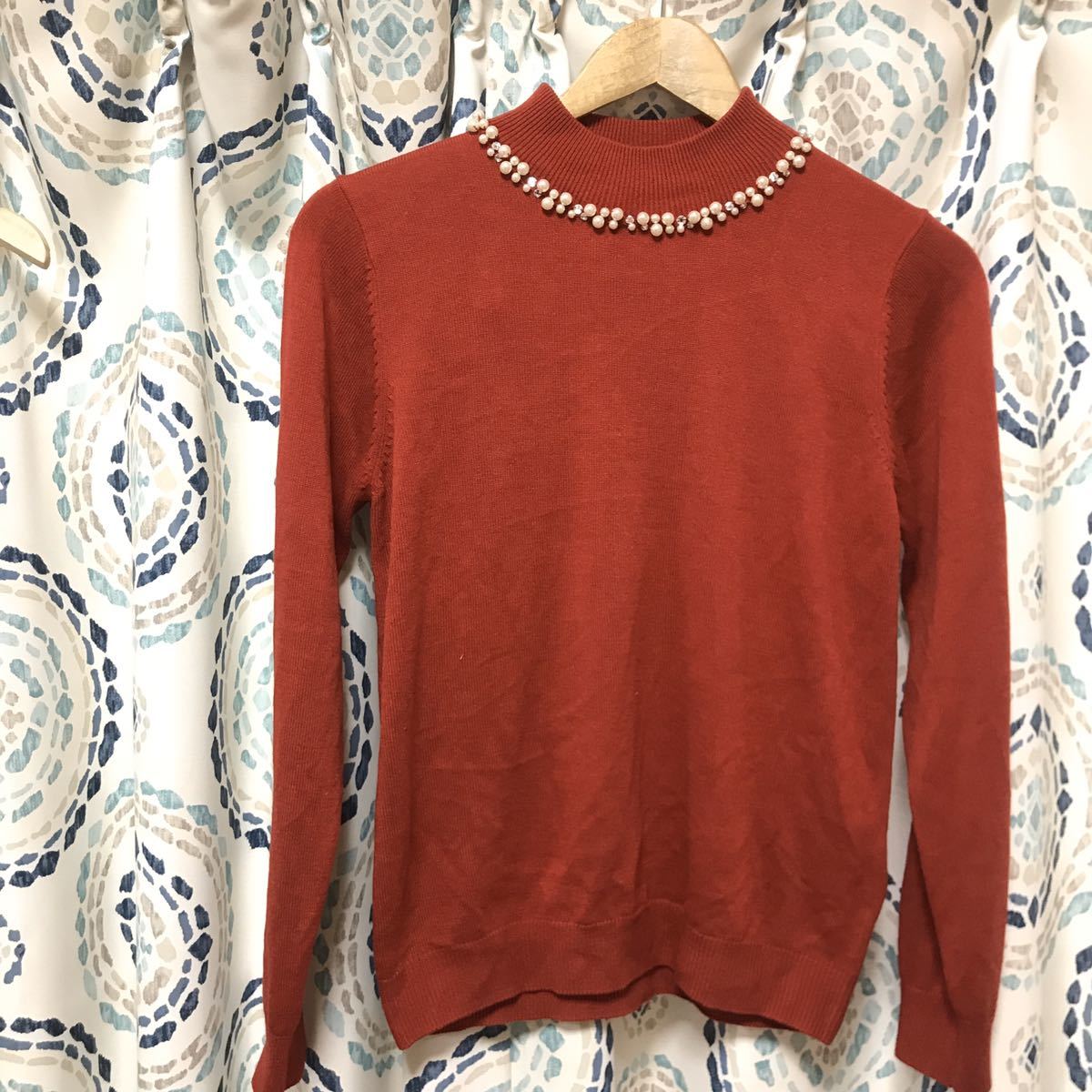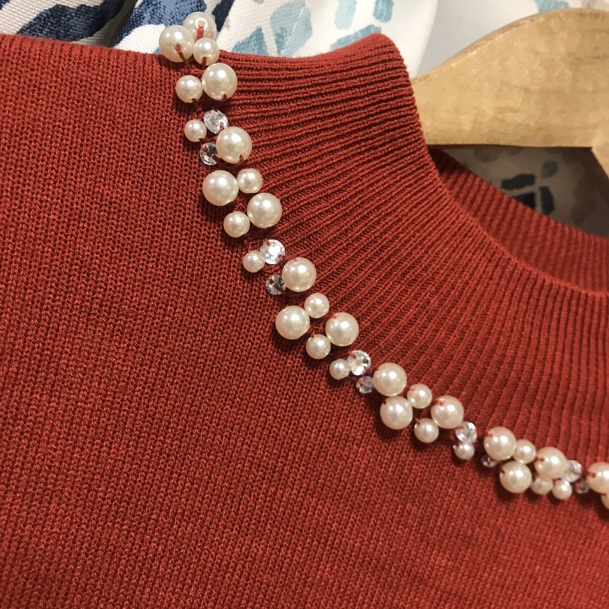 ◆ネック部のパールとキラキラストーンが可愛い長袖ニット