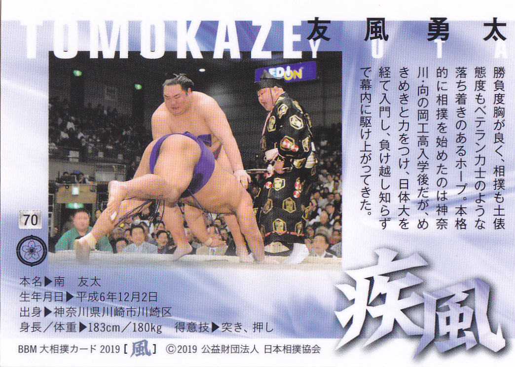 BBM大相撲カード2019[風] 70 友風 尾車部屋 神奈川県川崎市川崎区 岡工業高校 日体大 日本体育大学