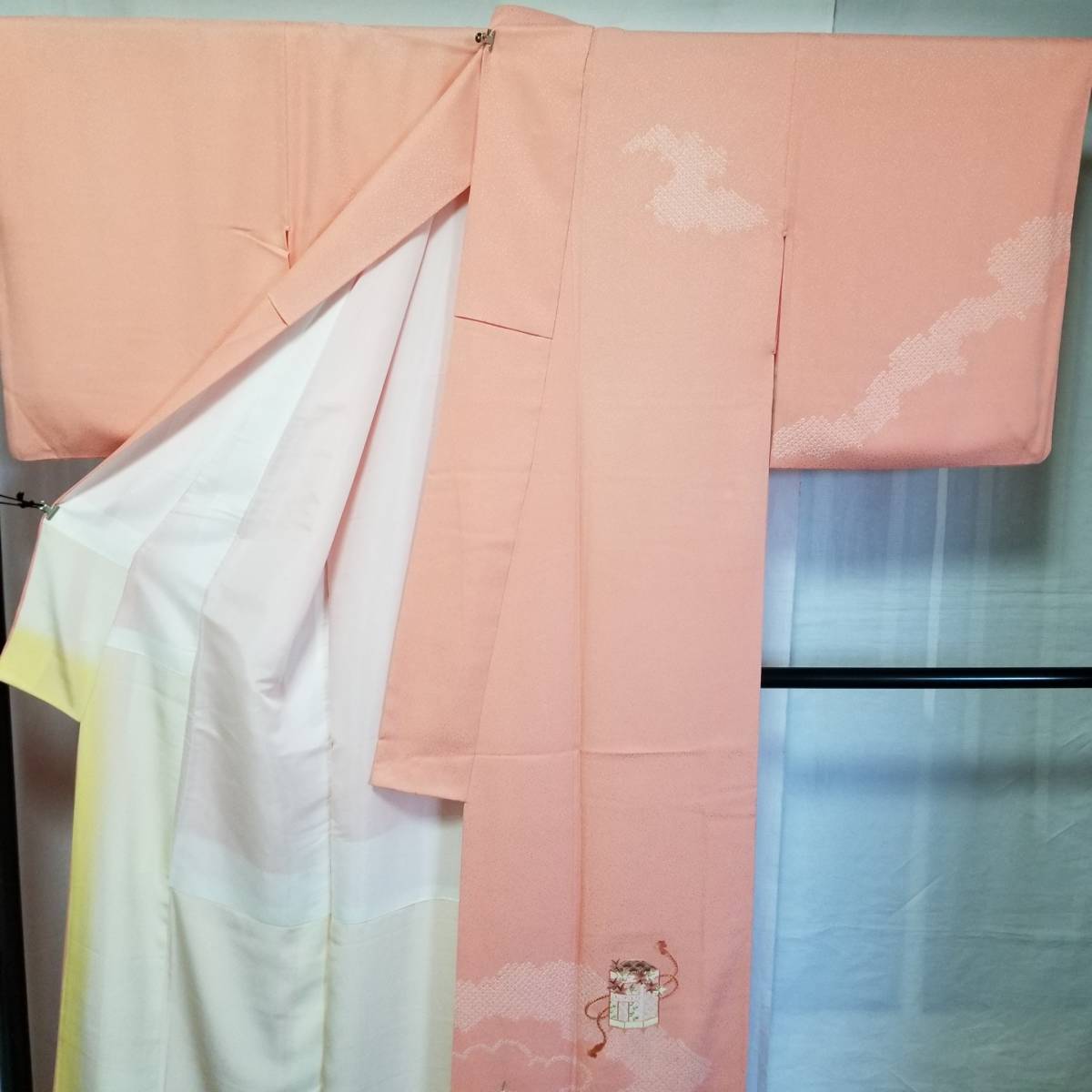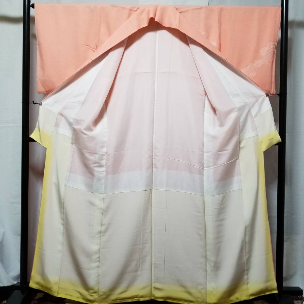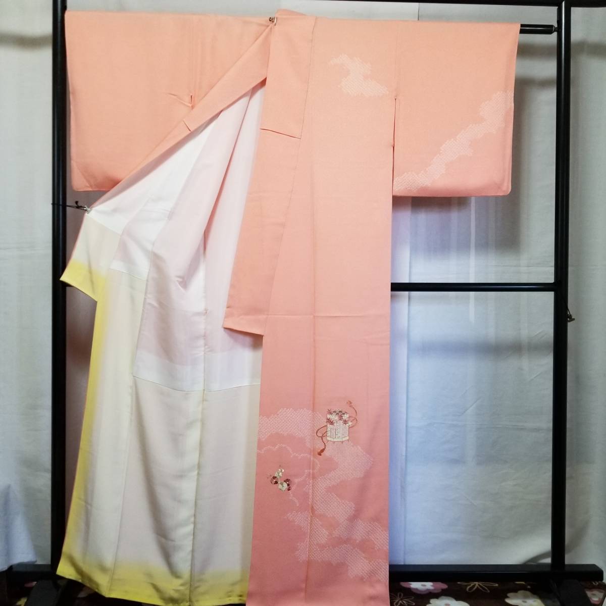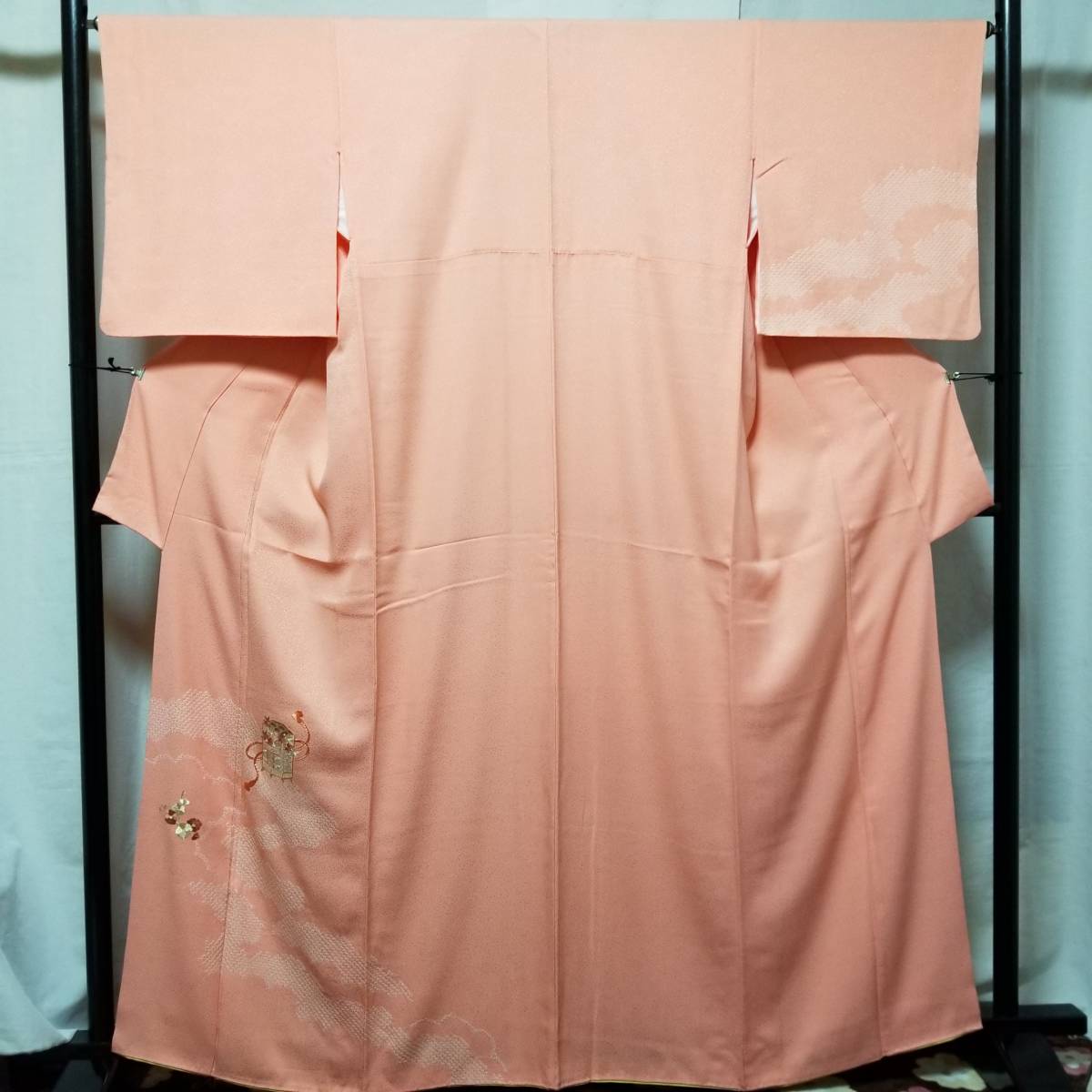 *手縫い仕立て品 *中古品 *未使用品 *検品済 *美品 {生地} ☆正絹 丹後 紋意匠縮緬{重目地}--砂をまき散らしたような小地紋 ☆着物重さ 約 900g {地色} ☆サ-モンピンク色に近いお色{やわらかい黄みの赤色}---着物の上部が光の具合で少し薄く写ってます--画像*8は明るく写ってます {模様} ☆極細.多色糸での微細手刺繍の貝桶と梅の花 ☆手絞り加工の流水文様--絞りの膨らみもございます {胴裏地} ☆ポリエステル100% 羽二重地{純白色}**美品 {八掛地} ☆正絹 精華縮緬地{タンポポ色*鮮やかな黄色*暈し染}**美品 ◎消費税は.お預かりしておりません◎ {寸法} 身丈 {肩から裾まで} 約165cm 裄丈 約66.5cm {袖付け縫い代 袖側 約1cm 身側 約2.5cm} 袖丈 約49.5cm 袖幅 約34.5cm 前幅 約23cm 後幅 約30.5cm *広衿{スナップ 2箇所付き} *袖付けには表地と共生地の人形止め付き (発送方法) ●大阪から ゆうぱっく発送 80サイズ{補償あり}**おてがる配送 ◎t6227jp 桐輪 「呉服の桐正」でも色々と出品しております** {注意事項} (注意事項 必ずお読みください!) ★基本的に土、日、祝日、ゴールデンウィーク、お盆、年末年始はお休みさせて頂いておりますので、ご連絡が遅れる場合もございますので、ご了承ください。 ★どうぞ自己紹介欄も、是非御覧になって下さいませ。 ●落札後にヤフーから届くメールに、メッセージを記載しておりますので、 そちらも必ずご覧下さいませ。 ●当方、ストア出品ではなく、一日中パソコンに向かっておらず、ご連絡は夜になる事が多いです。その点御理解の上、ご入札下さい。 ●お急ぎの場合など、到着希望の日にちが特に近い場合、ご要望にお答えできかねる場合もございます。もちろん、出来る限り、早急に対応はさせて頂きますが、 その点は、何卒ご了承下さいませ。 入札前に、発送が間に合うかご質問頂けるとありがたいです ★★基本的に返品、クレームはお受け致しておりませんが、万が一、商品に不都合(大幅な寸法間違い 記載以外の着用不可能な位の、大きなシミ、傷みなどの見落とし)などがございました場合、まず、取引ナビにてご連絡下さいませ。 迅速に対応させて頂きます。 ただし ●商品がお客様の元に到着後、1週間以上経過したもの。 ●お客様側で加工など、手を加えた物。 ●お色目が、思っていたものと違っていた、または、思っていた感じと違っていた。 (画像はできるだけ実物に近い色で写るように努力していますが、素人の撮影ですので、どうしてもPCによって多少違ってくる事があります。出来るだけ、分かりやすいように説明は入れさせて頂きます。分かりにくい場合、ご質問下さい。) 以上につきましては、対応出来ませんので、ご理解下さい。 ★複数商品の落札予定のある場合、ご連絡頂きましたら、1週間程でしたら、お取り置させて頂きます。 お気軽に、お申し出下さいませ。 ★送料は、1個で発送が無理な場合は、こちらよりご連絡させて頂きます。 | |||