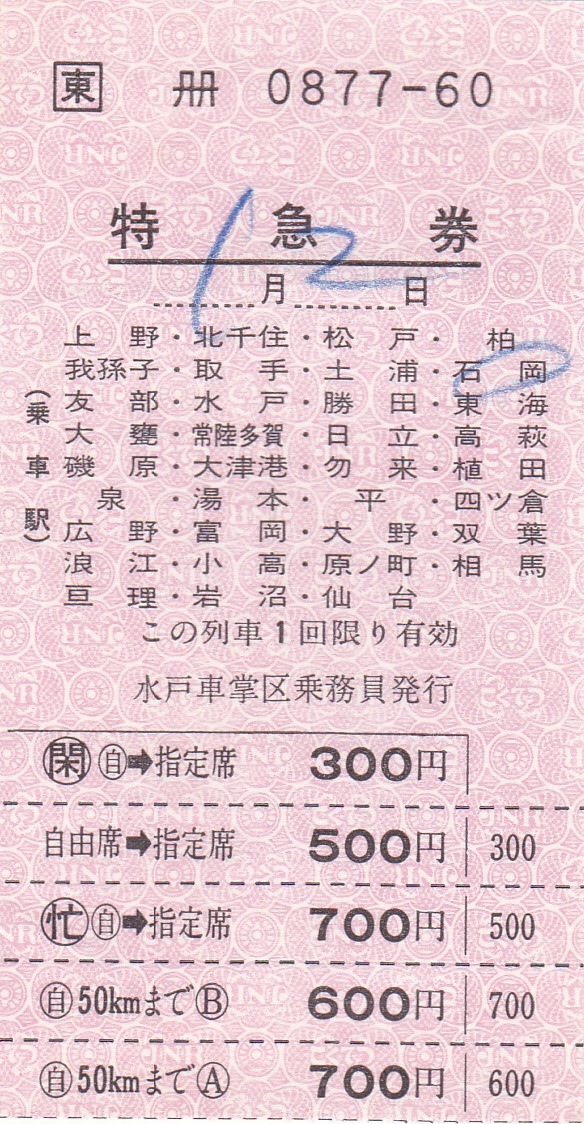 【JR東日本】水戸車掌区乗務員発行 短冊式特急券 国鉄地紋