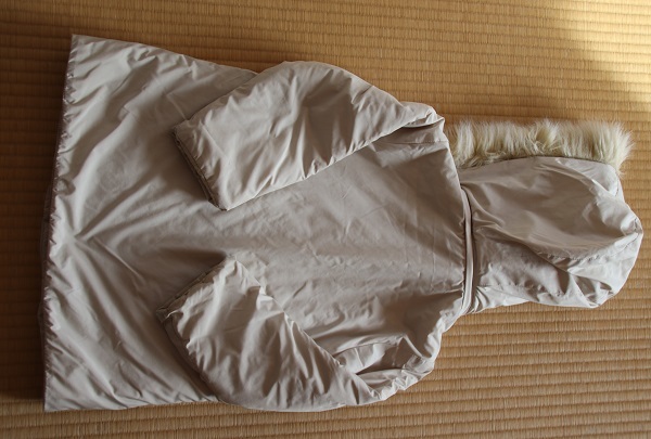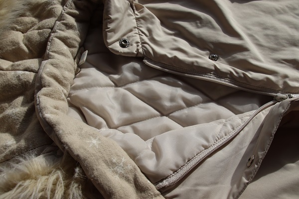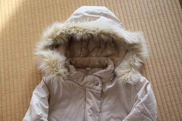 ベージュでフードどの内側が雪の模様でお洒落です。男女どちらでも