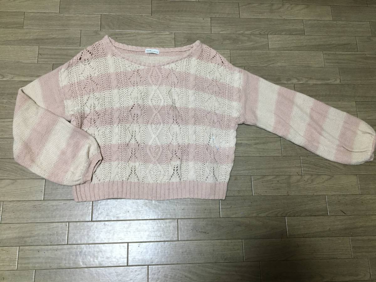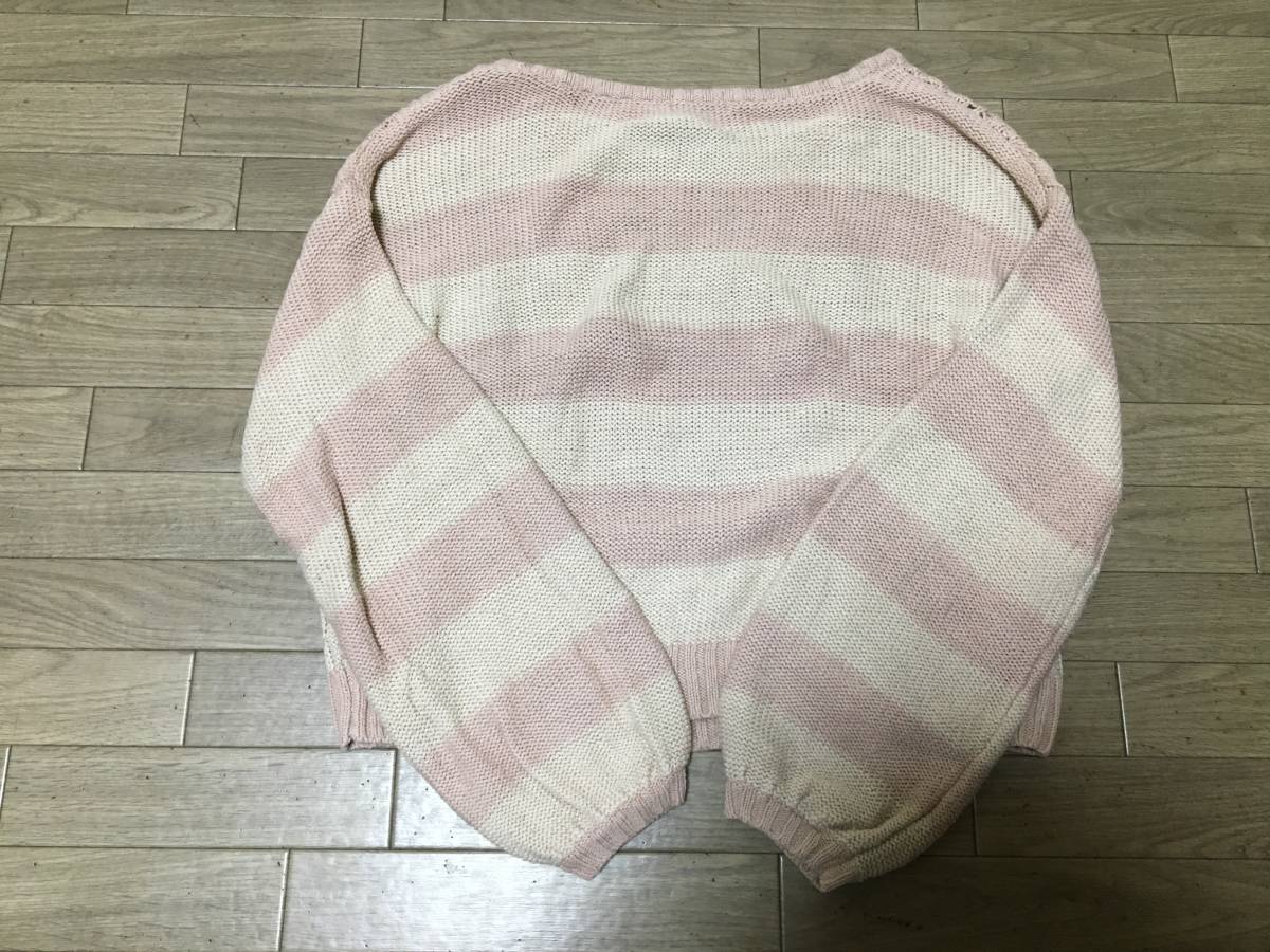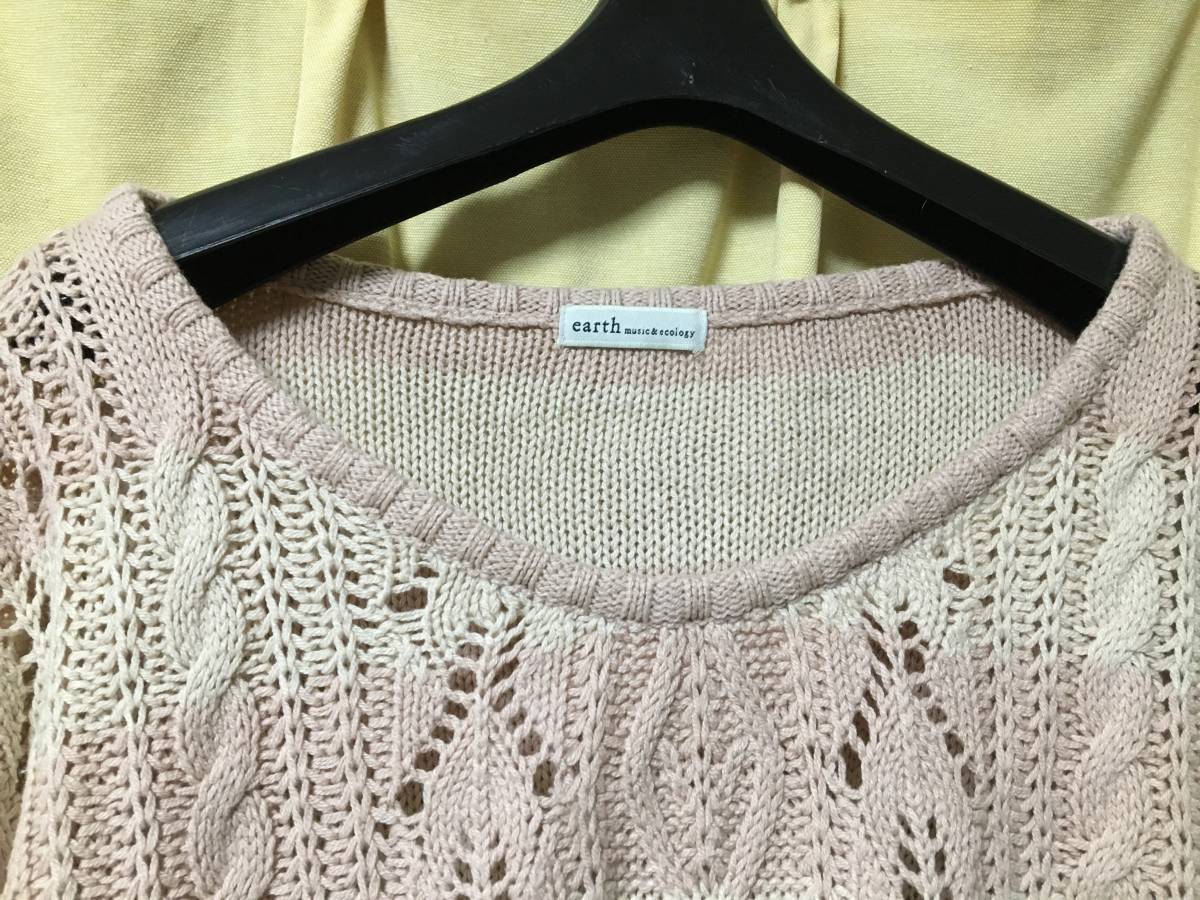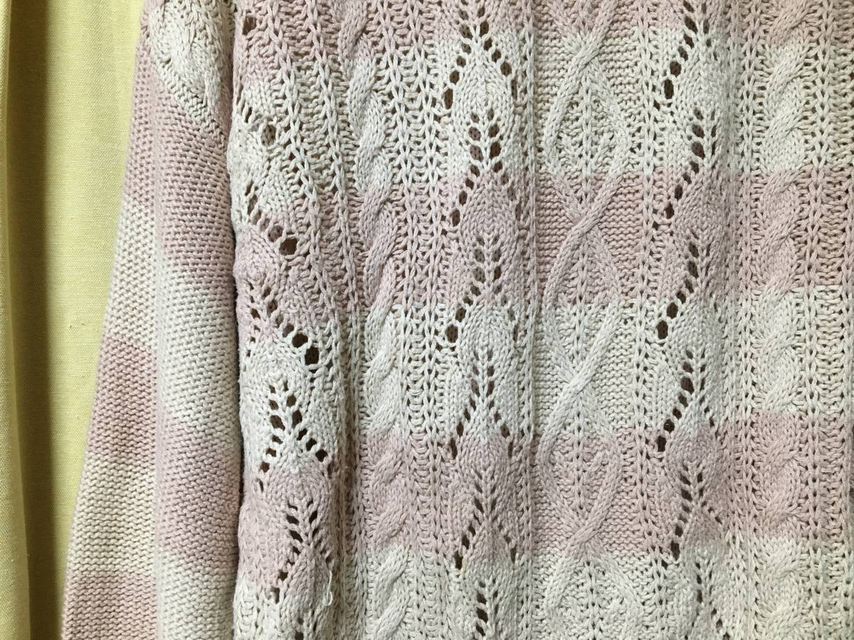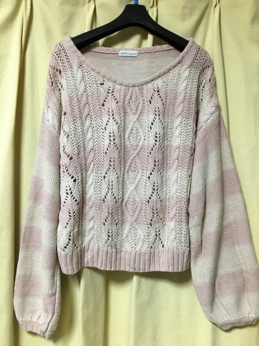 おなじみ 大人気、 earth music&ecolojy スモーキーピンク×アイボリー模様編みボーダー ニット サイズFです。
