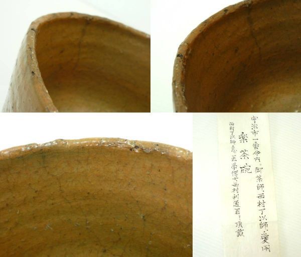 必見 楽茶碗 抹茶碗 銘有 在銘 茶道具 京都 宇治市 当時書類付 西村了以師所有 楽焼 11.5X8.5cm 328g 正規品 華道 骨董 レア希少 本物 美品