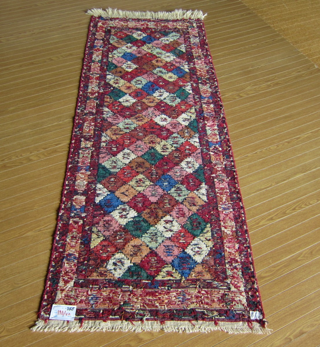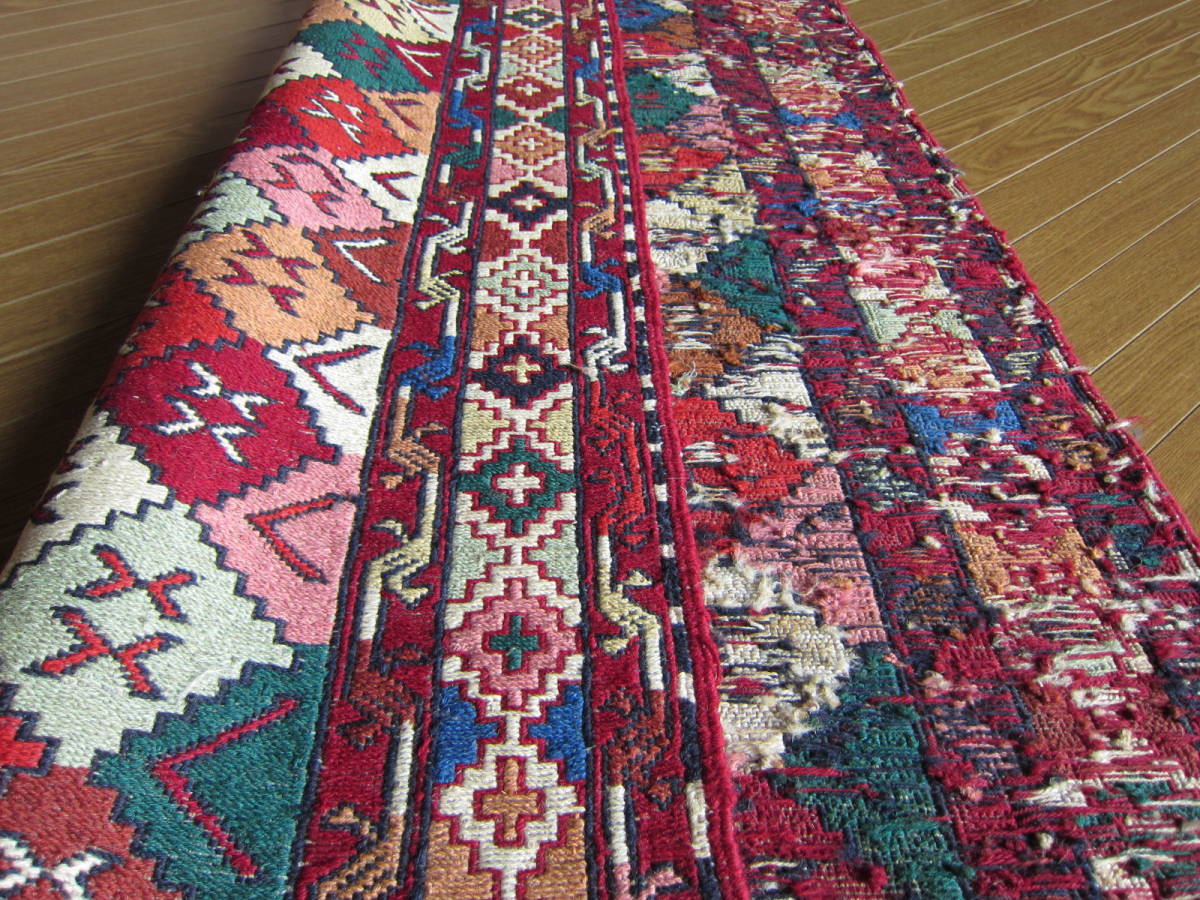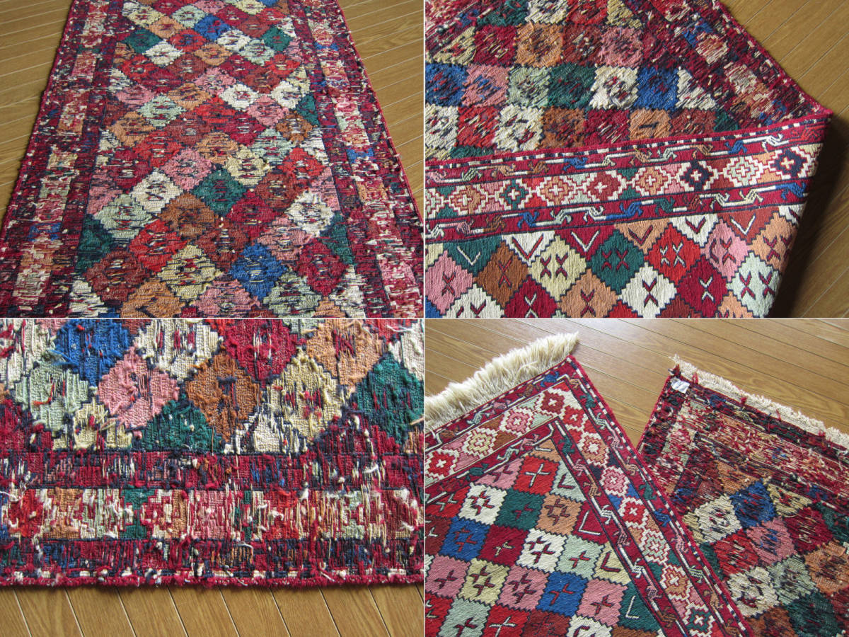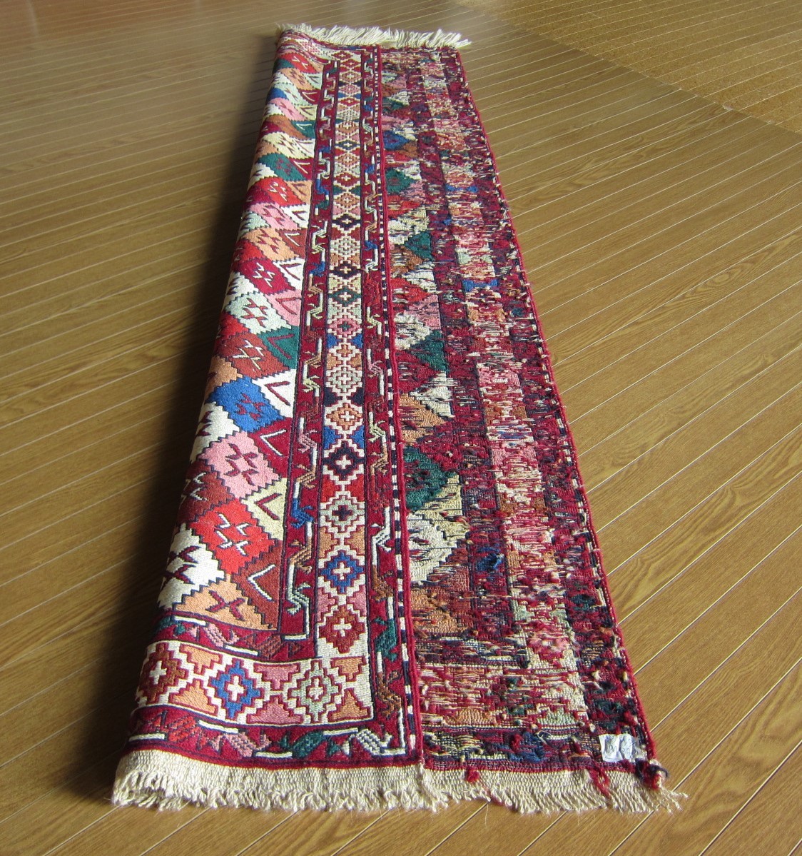 商品説明 | ★素材 : ウール・手織り・スマック織り ※スマック織りとは、イランのキリムの織り方の技法です。 土台の縦糸と横糸の上にもう一本横糸を絡めるように 巻き込んで織っていく高度なテクニックで、 刺繍のように細かな文様を描けることができます。 スマック織りは裏面に模様の糸を渡してあるので 片面使いのキリムになります。 ★サイズ : 約 195×78 cm (房を含まない長さです) ★産地 : イラン・アゼルバイジャン ★状態 : 新品 kxpgs342+ZIBACARPET絨毯 kxpgs342+ZIBACARPET取扱いペルシャ絨毯 FARSHEZIBA_KILIMキリム |