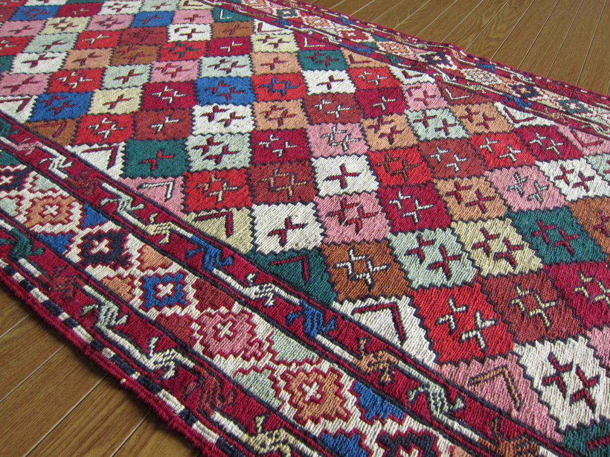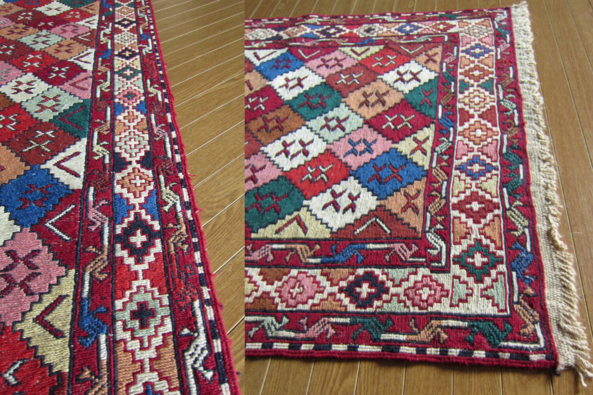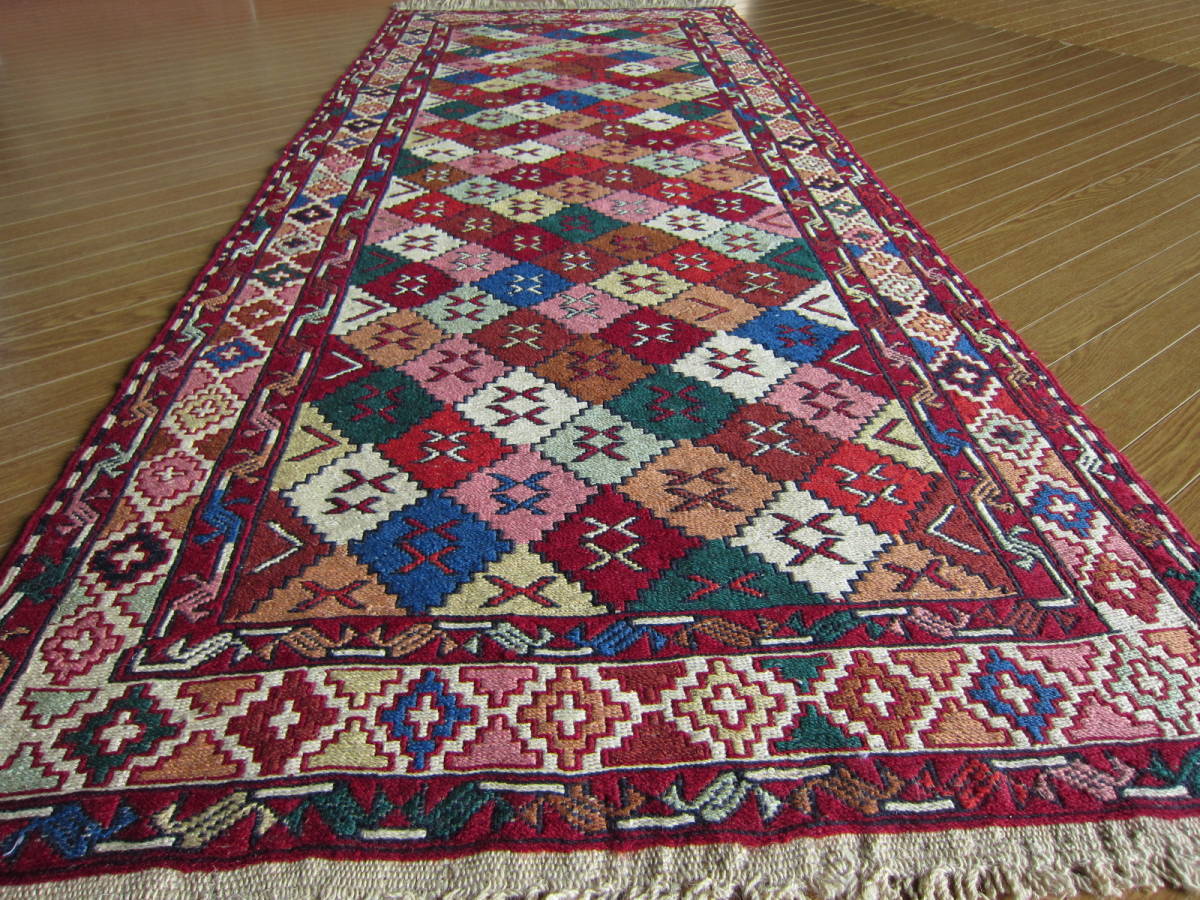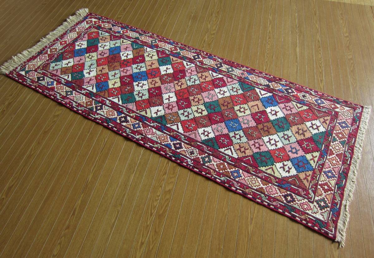 商品説明 | ★素材 : ウール・手織り・スマック織り ※スマック織りとは、イランのキリムの織り方の技法です。 土台の縦糸と横糸の上にもう一本横糸を絡めるように 巻き込んで織っていく高度なテクニックで、 刺繍のように細かな文様を描けることができます。 スマック織りは裏面に模様の糸を渡してあるので 片面使いのキリムになります。 ★サイズ : 約 195×78 cm (房を含まない長さです) ★産地 : イラン・アゼルバイジャン ★状態 : 新品 kxpgs342+ZIBACARPET絨毯 kxpgs342+ZIBACARPET取扱いペルシャ絨毯 FARSHEZIBA_KILIMキリム |