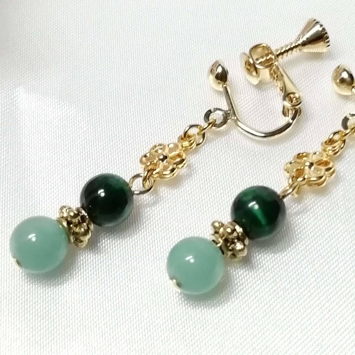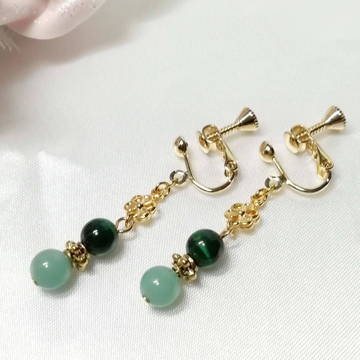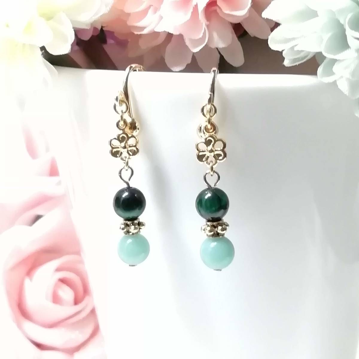 | ★商品内容★ グリーンタイガーアイの短めハンドメイドイヤリング/天然石/上品/タイガーアイ/ゴールド/アマゾナイト/シック/シンプル/短め/緑/フラワー グリーン系の天然石を使った 短めサイズのイヤリングです°??*・**??°*・**. 濃い緑色と優しいミントグリーンを ゴールドのパーツと組み合わせることで シックでゴージャスな大人の女性らしさを印象付けます*・**.。・*・.**.・。 普段使いはもちろん、オフィスにも お出掛けやお洒落のワンポイントにも最適です*・**.。・*・.**.・。 【素材】 天然石グリーンタイガーアイ(緑虎目石)6mm 天然石アマゾナイト(天河石)6mm メタルチャームフラワーゴールド7mmx6mm メタルスモールサタンリングゴールド(ピューター製) カンより垂れ下がる長さは、約3.2㎝です。 Eー765 【天然石豆知識】 ◆◆グリーンタイガーアイ[緑虎目石] ガラス光沢を持った美しい金褐色の鉱物 金色の光線が“虎の目”に似ていることに由来しています。 古代より幸運を招く聖なる石として崇められ、エジプトでは神々の像の目に使用して聖なる視野を表したと言われています。 洞察力や決断力を養って物事を成功へと導き、邪悪な力を跳ね返して金運・仕事運を良くすると伝えられています。 ◆◆アマゾナイト(天河石) ガラス光沢を持った緑色の半透明な鉱物。含有している微量の鉛の作用により緑色に発色します。 実際には産出されませんが、“アマゾン川”に由来しています。 古くから「希望の石」として珍重されてきました。 ストレスを解消して精神と肉体の強化を図り、思考力・創造力などを高める働きがあると伝えられています。 ★注意事項★ ***~ご購入前に必ずお読み下さい~*** *・*・*落札後について*・*・* *落札後4日以内にお手続き、ご連絡が無い場合は落札者都合で削除致します。 *発送日指定・ご入金の予定が1週間以上先をお考えの方は、入札の前に質問よりご連絡くださいませ。 予めご了承の上、ノークレーム・ノーリターンでお願い致します。 *・*・*商品について*・*・* *一点一点心を込めて作っておりますが、手作りなため多少の歪み等あるかもしれません。 手作りの味わいと、世界で一つだけの作品とお考えいただければ幸いです。 *デリケートな商品ですので、強く引っ張ったりすると破損する事もあります。 お取り扱いにはご注意ください。 *ご覧のPC、スマホによっては画像と実物の色味が多少異なる場合があります。 *基本イヤリング金具は跳ね上げネジ付き金具にて作成しております。 **ご希望によりピアスへの変更も承っております。 【フックピアス…無料/キャッチピアス…別途追加料金120円】 *その他…樹脂ノンホールピアス(無料)・カン付き樹脂ノンホールピアス(別途追加料金20円)にも変更をお受け致します。 ~ご注文の際にメッセージ欄よりお申し付け下さい~ 尚、金具変更のご希望が無い場合は、掲載された写真の金具にてお送り致します。 *金属アレルギーへの対応はしておりませんので、ご心配な方はご遠慮下さいますようお願い致します。 *永くご愛用頂くために、ご使用後は柔らかい布等で軽く拭いてください。 *・*・*プレゼント用梱包のご要望もお受けいたします*・*・* *その際は、梱包費用が別途で必要となりますのでご注意ください。 また、ご希望の梱包タイプによって、発送方法が変わりますので、送料が別途必要となります。 プレゼント用梱包タイプ 【袋→100円】 発送方法【クリックポスト(送料無料)】 プレゼント用梱包タイプ 【箱→200円】 発送方法【レターパックプラス(別途520円)】 袋タイプは【合計100円の追加料金】、箱タイプは【合計720円の追加料金】となります。 ◆ご希望の場合は、必ず商品ページをウォッチリストに登録した上で落札前に質問にてお問合せ下さい。◆ ◆ご希望を承り次第、一度出品を取り消し、プレゼント用梱包費用、送料などを追加した金額へ変更し、再出品致します。◆ *再出品後に再度検索して頂く手間が省けますため、プレゼント梱包をご希望の場合は必ずウォッチリストへのご登録をお願い致します。 金額変更後の再出品から3日以内に落札されなかった場合、誠に勝手ながら購入する意思がないとみなしまして、元の金額へ修正致します。 また、修正後、再度プレゼント用梱包のご希望のお問い合わせを頂きましても、お断りをさせていただきますのでご注意ください。 ご不明な点がございましたら、落札前に質問よりお願い致します。 ***ご質問について*** *ご購入前にお願い致します。 日中は仕事をしておりますので、ご返事が直ぐに出来ない場合がございます。 出来る限り早い対応を心がけますが、ご了承ください。 また、発送までには、お振込み確認後、翌日の発送を心がけておりますが、仕事の都合により2~3日程かかる場合がございます。(その際にはナビにてご連絡いたします) お急ぎの場合は、極力対応いたしますが、場合によっては対応致しかねる事もあります。ご了承下さいませ。 | |||
