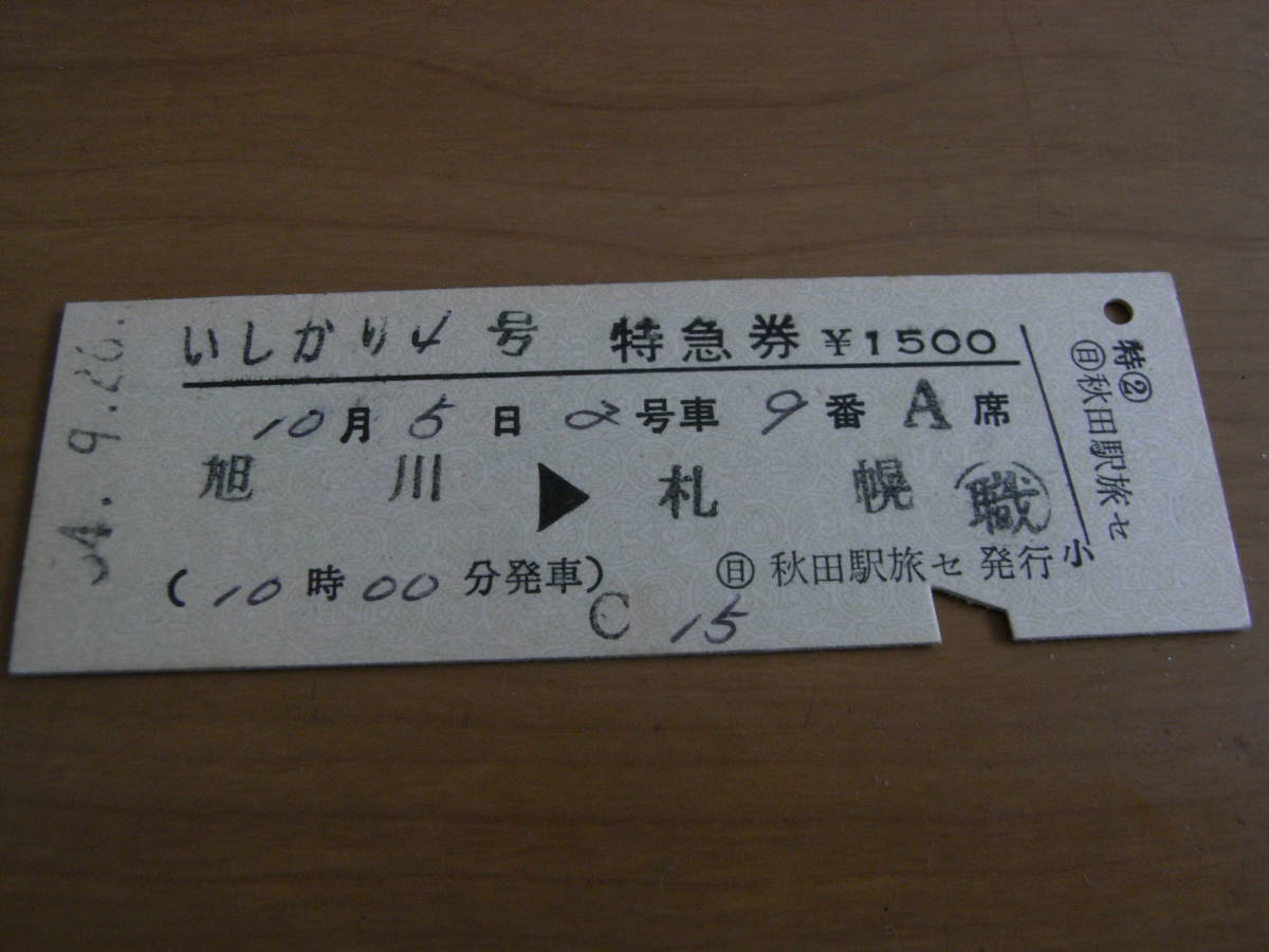 いしかり4号特急券 旭川→札幌 昭和54年9月26日発行 日 秋田駅旅セ発行