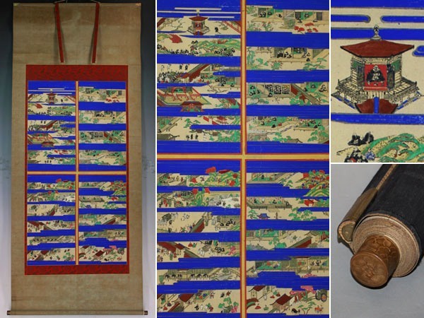 古仏画【親鸞聖人御絵伝】 本紙は、汚れ、折れ多数、皺多数、剥れがあります。 表装は、汚れ、折れ多数、ヤケ、虫食、裏側にほつれ、破れ、 軸先に傷、へこみがあります。 【サイズ】 作品 横約54cm×縦約100cm 表装 横約71cm×縦約171cm |