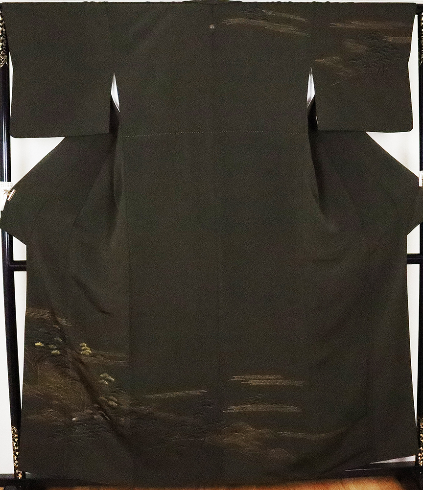 | 訪問着 袷 丹後縮緬地 抹茶かかった濃い緑ぼかし地 橋に松に鳥 金糸竹屋町刺繍 166 広襟 一つ紋 | |
