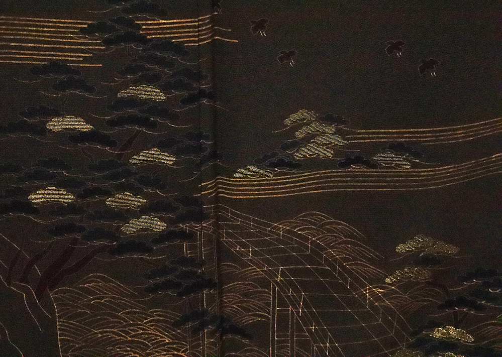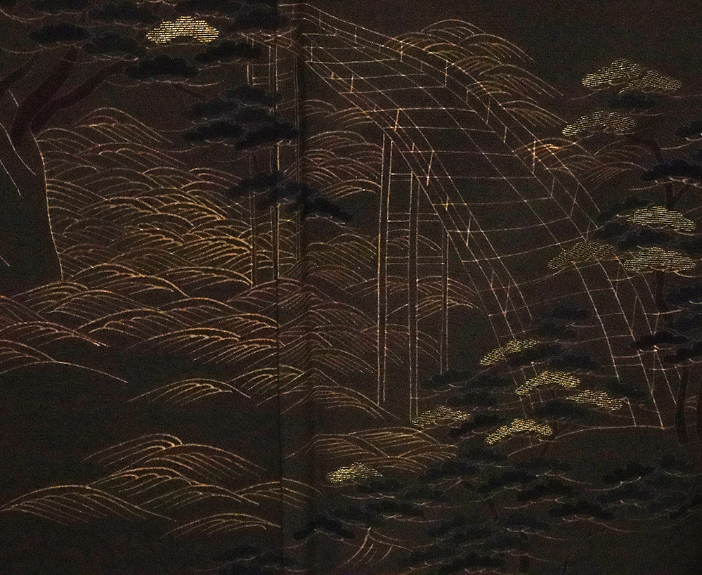 | 色・柄 | 訪問着 袷 丹後縮緬 綸子生地 抹茶かかった濃い緑ぼかし地 橋に松に鳥 金糸竹屋町刺繍 (写真では上手く色が出ない場合があります。ご了承下さい) |