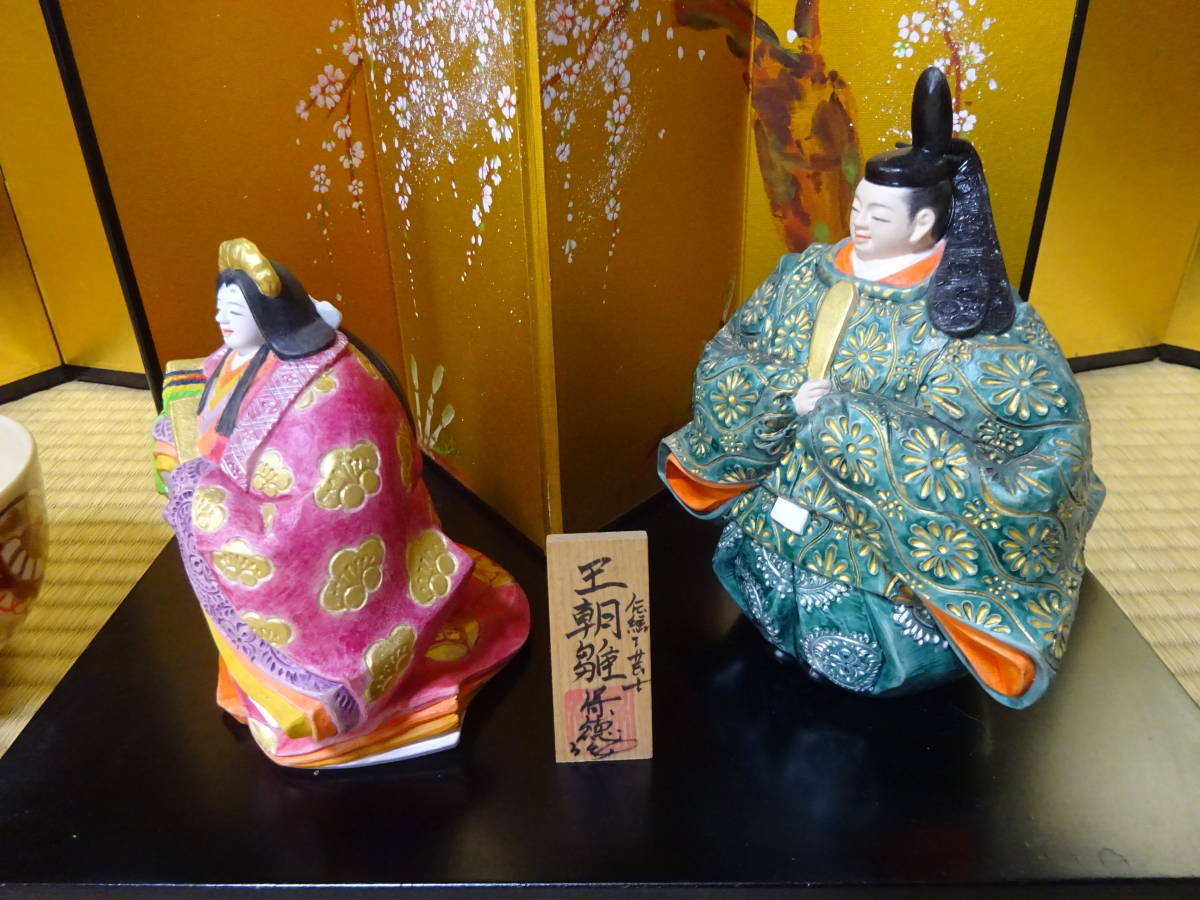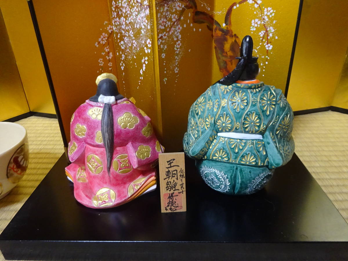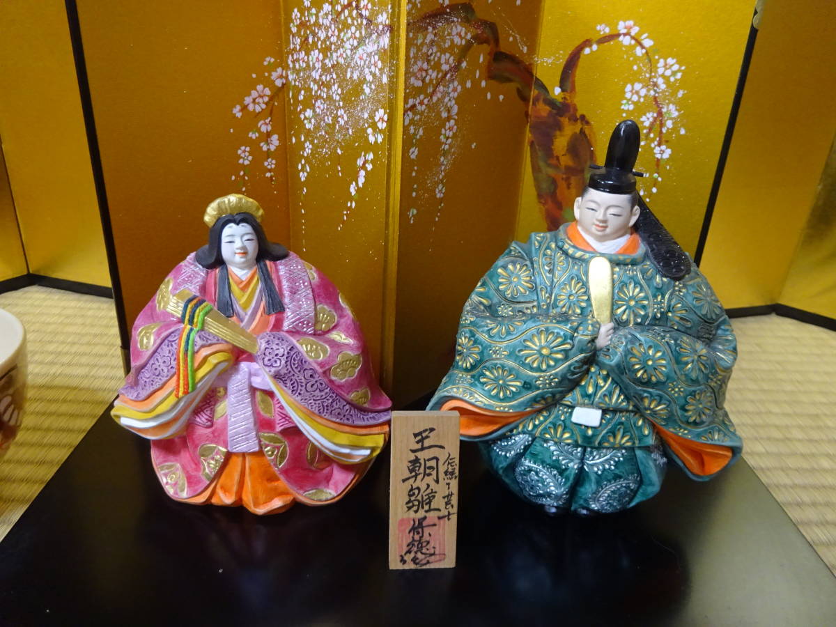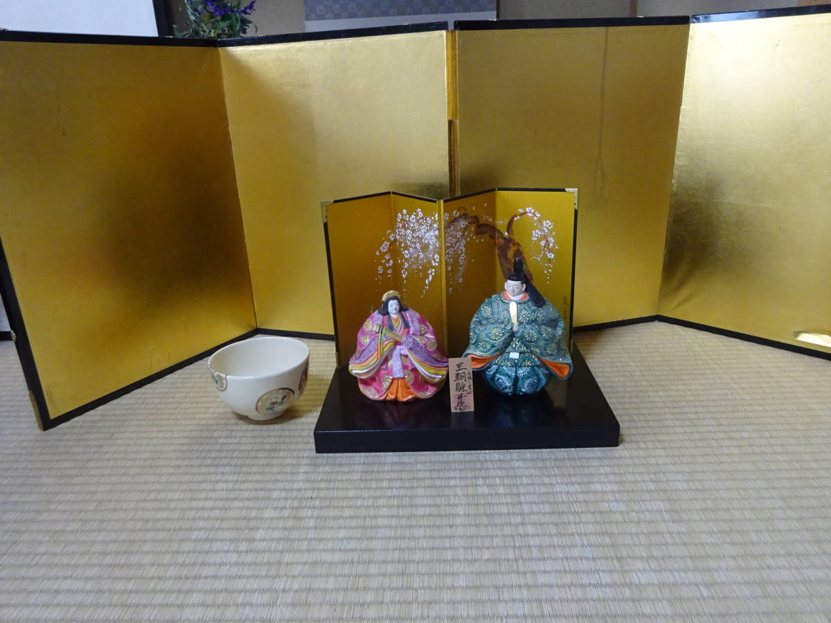 男雛の身長約17cm(帽子含む)、女雛の身長約14cm(髪飾り含む)です。細密な作りと絵付けがとても重厚で華やかなので存在感のある美しいお雛様です。黒い四角台(木製)と作者肉筆の絵柄の屏風付きです。抹茶碗は大きさの比較のためで付いておりません。出品しております商品は中古品やアンティーク品です。充分点検しておりますが、僅かな見落としがある場合はご容赦下さい。また、色合いも忠実に再現できない場合もありますのでご理解下さい。完品をお求めの方や匂いが気になる方、神経質な方のご入札はお控え下さいませ。また、いかなる理由があっても入札後の取り消しには応じられませんので慎重なご入札をお願い致します。24時間以内にご連絡頂ける方、3日以内にご入金頂ける方のご入札をお待ちしております。お取り置きは10日位までお受け致します。郵パックは元払い(80サイズ)でお送り致します。