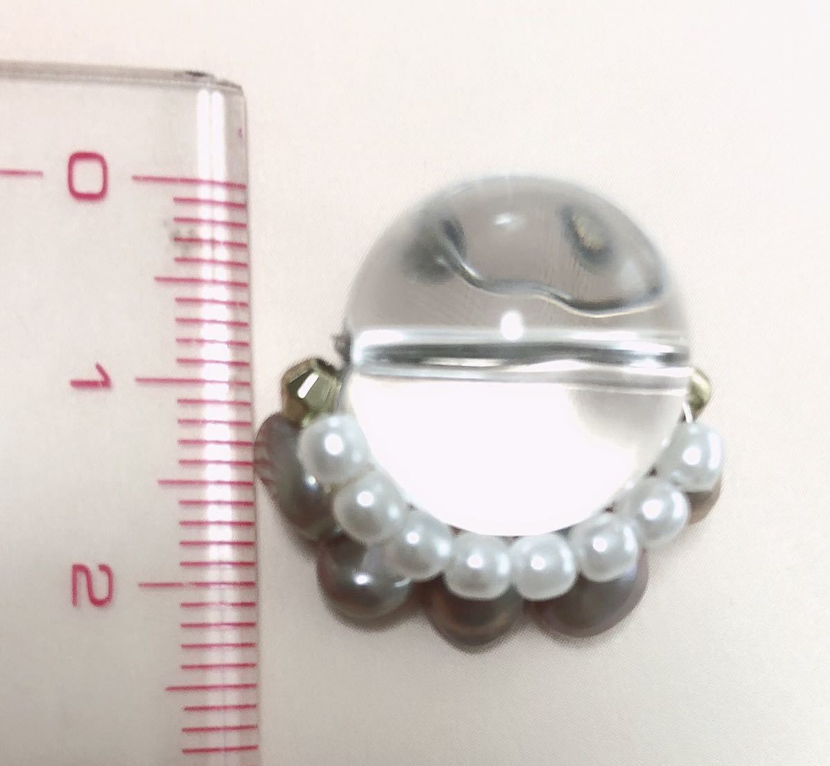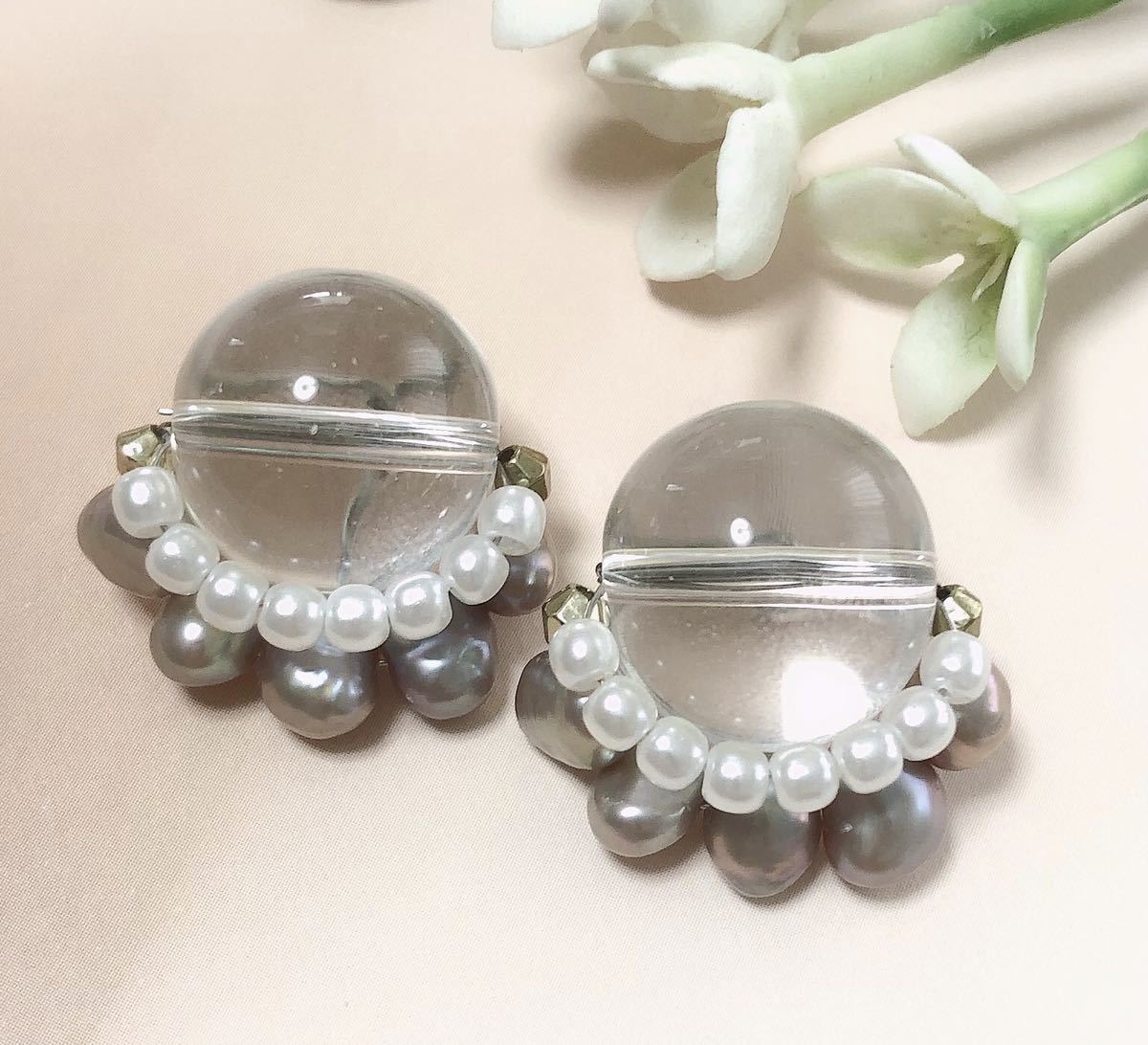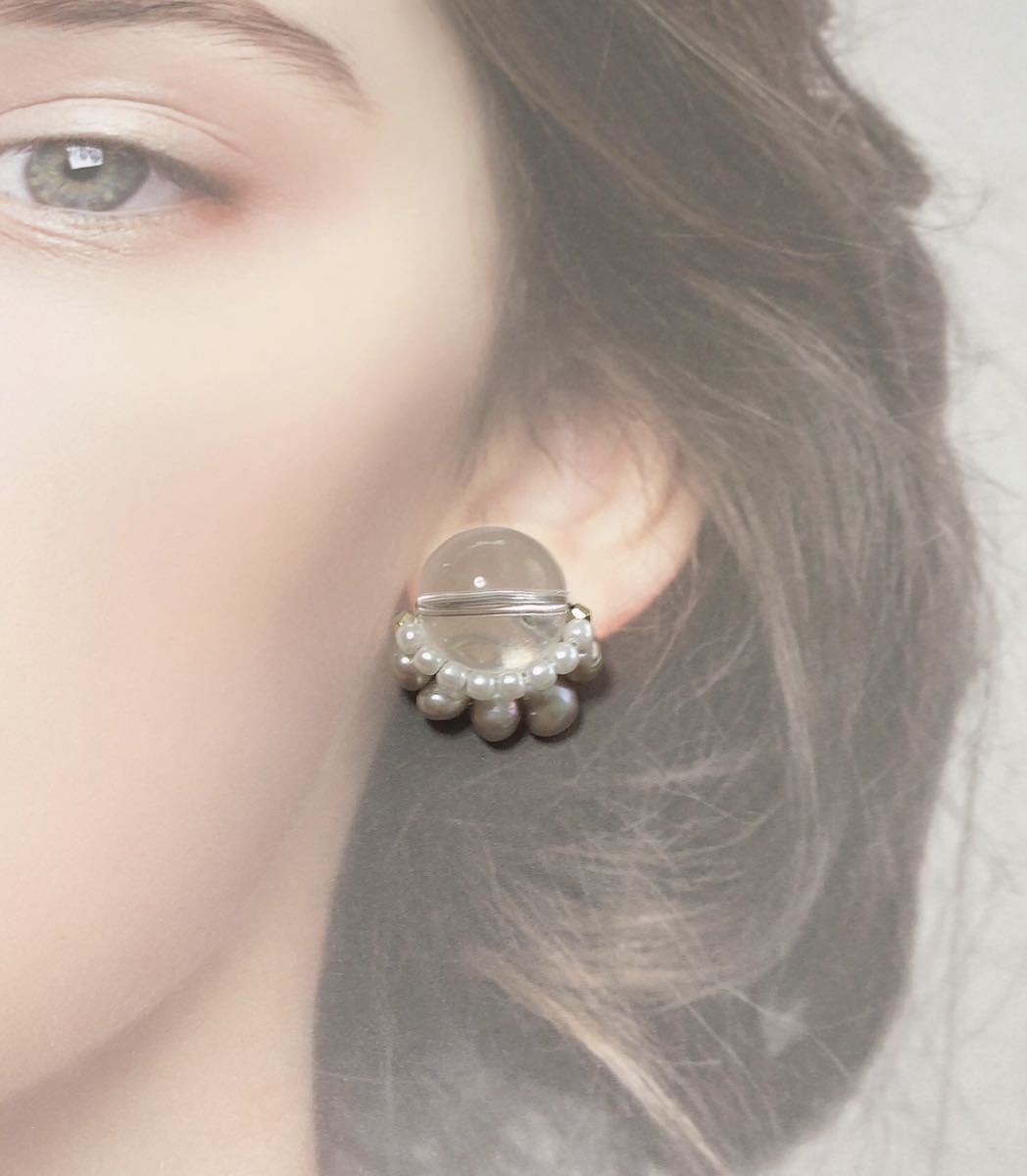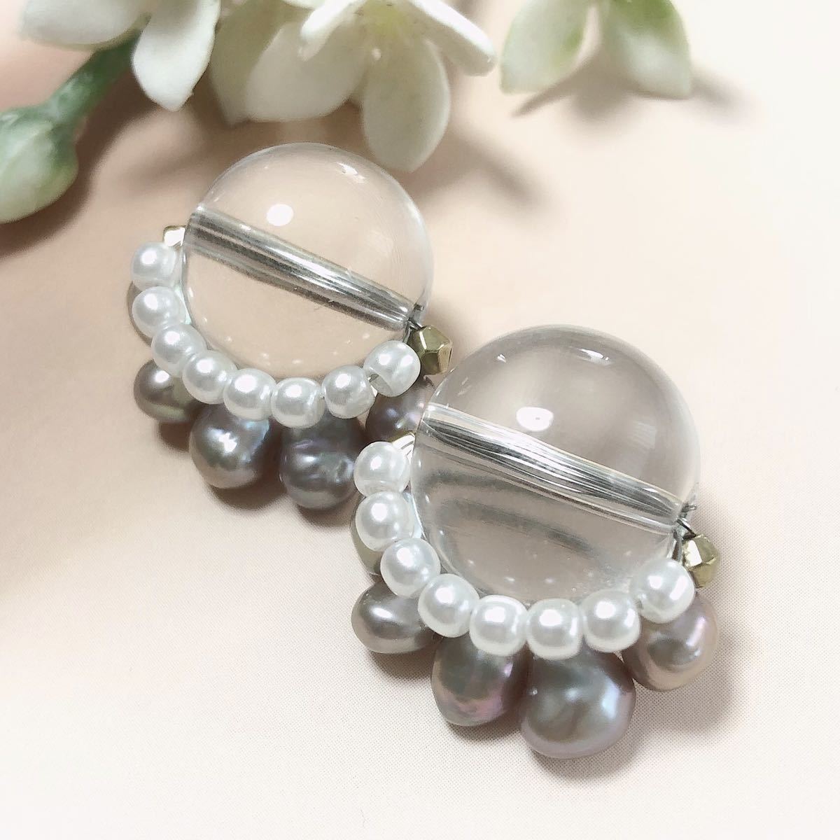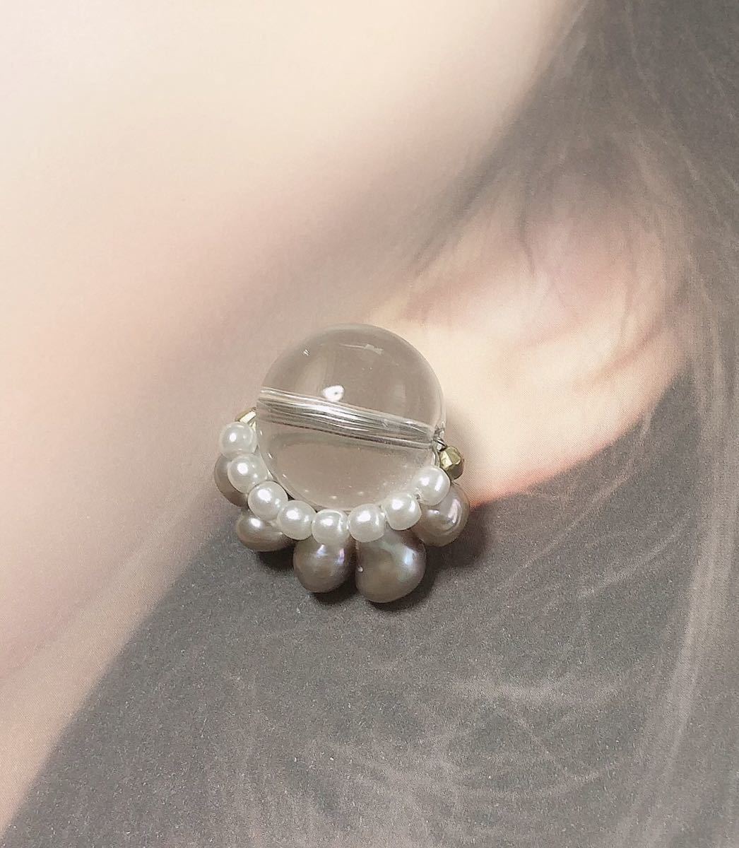 スモーキーグレー 淡水パールとラウンドグラスの大玉ピアス クリスタルガラス