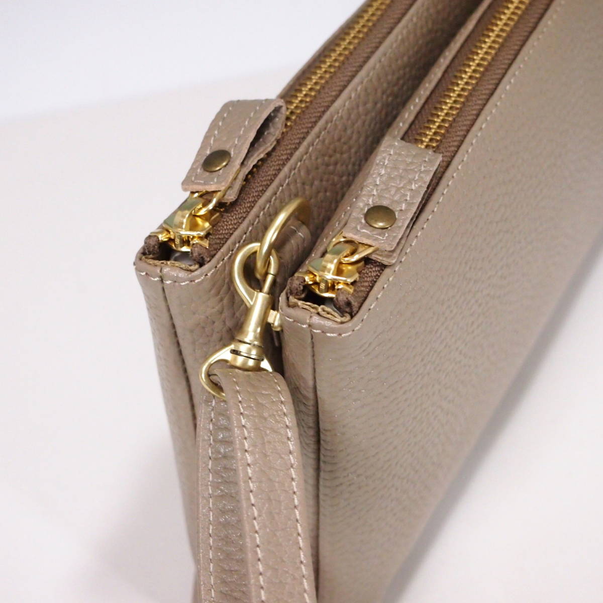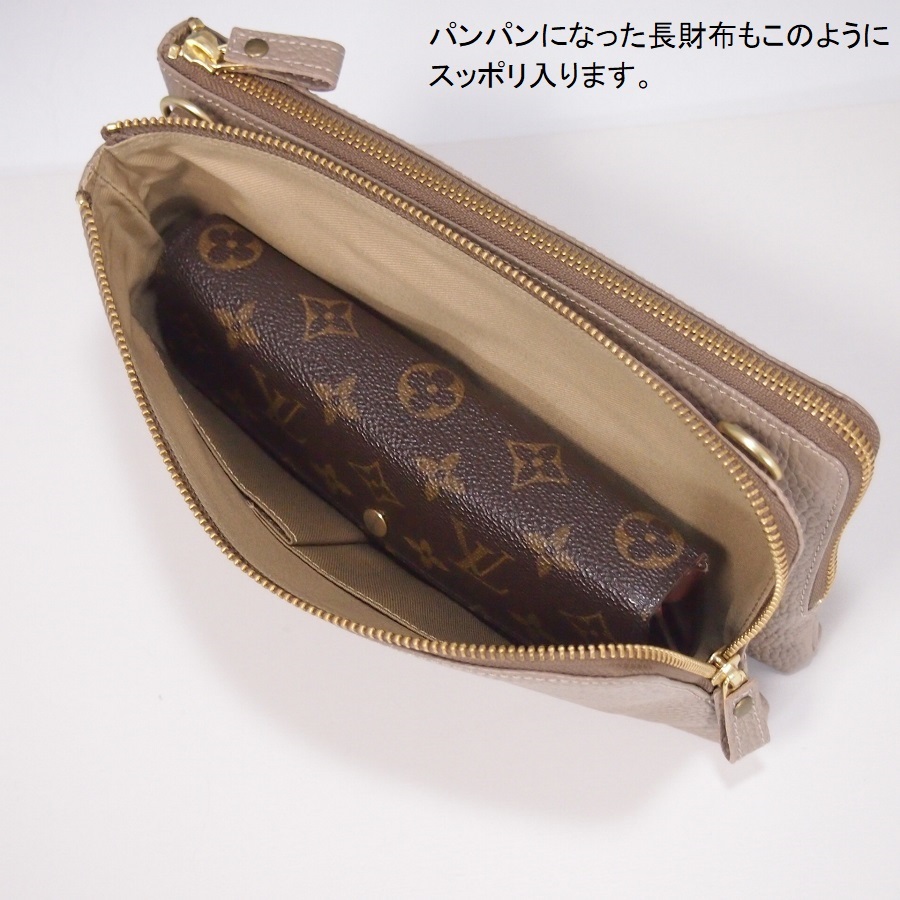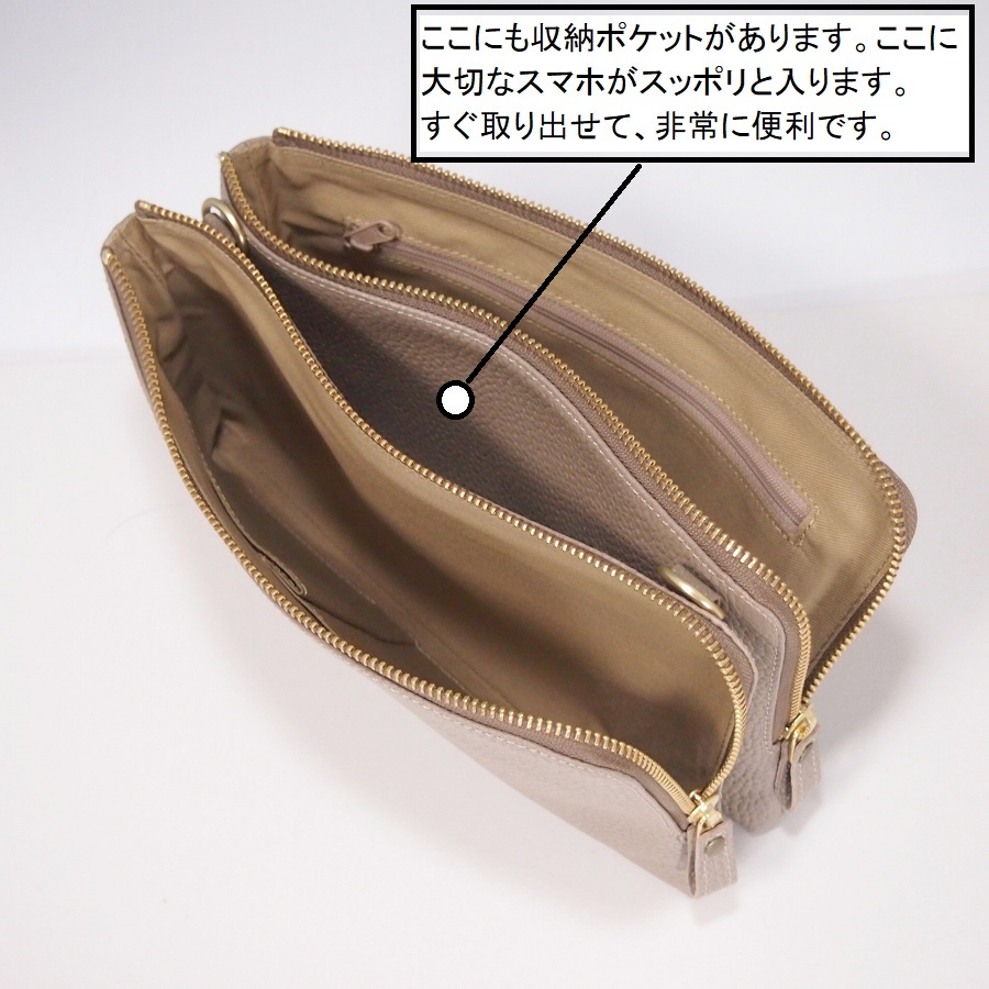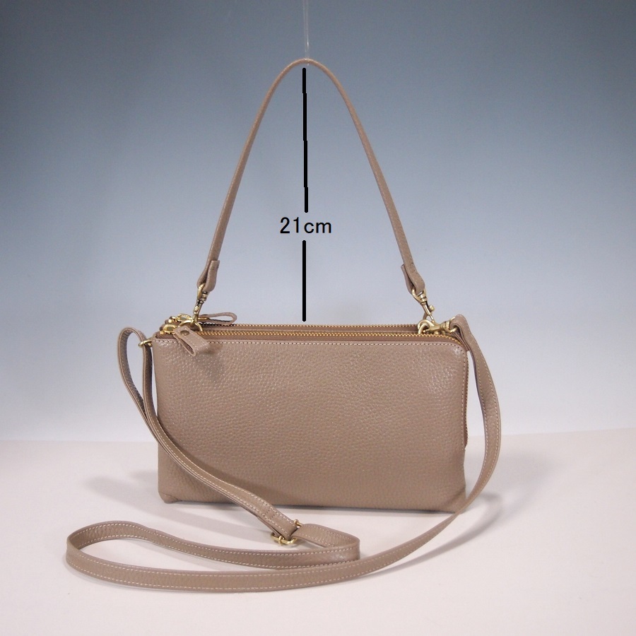 ★新品★ハンドメイド★日本製★ソフト本革★お財布ポシェット★ダブルファスナー★ハンドル付き(取り外し可)★ショルダーバッグ★トープ