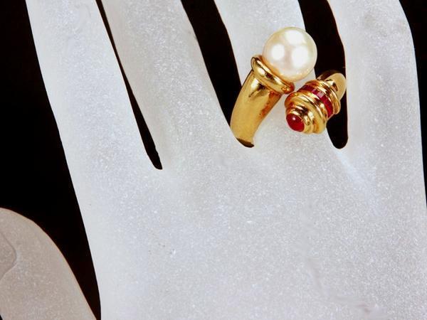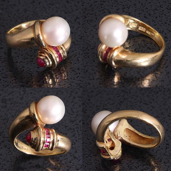 K18金9.7mmアコヤ真珠とルビーのリング指輪12号です。