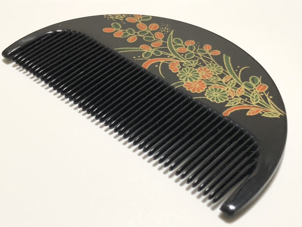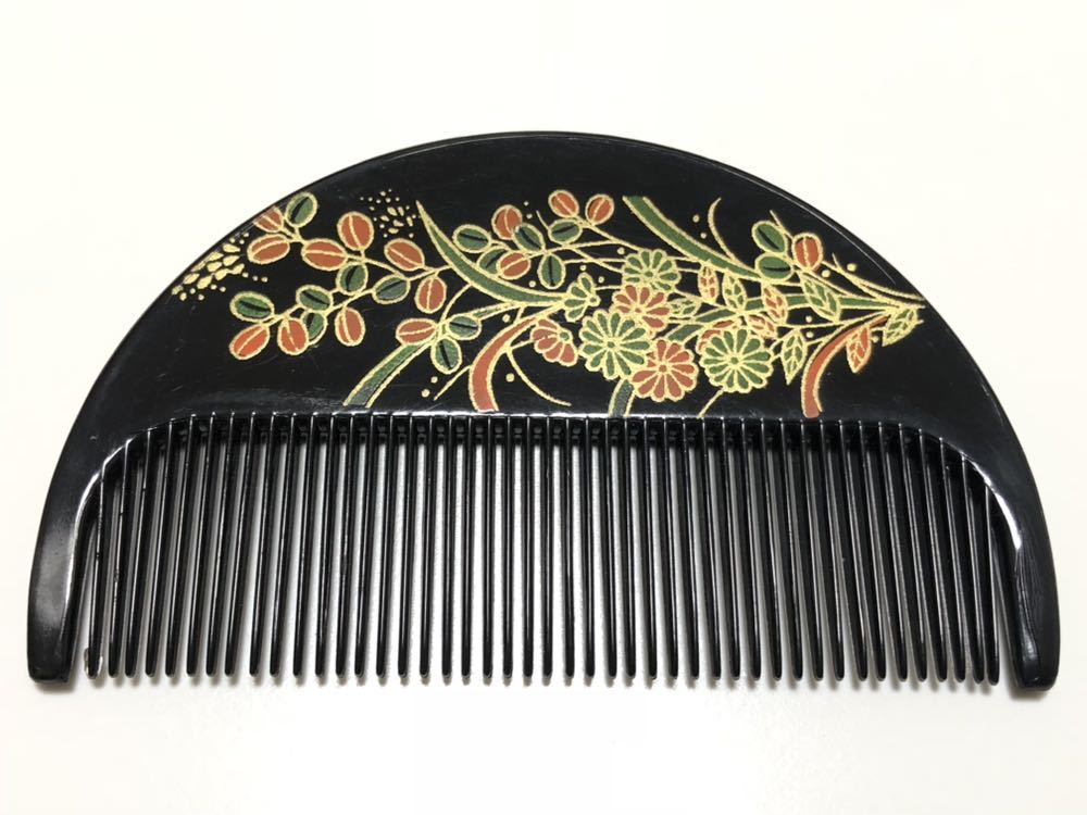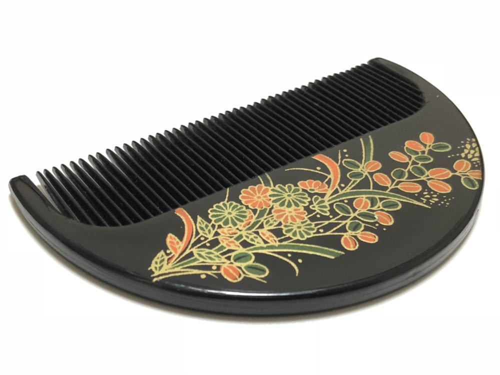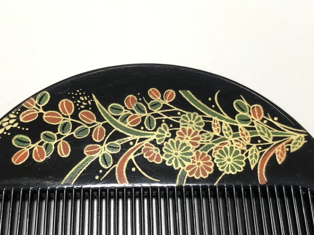 樹脂製の蒔絵で秋草文を施した、円形の櫛です。小キズがあります。