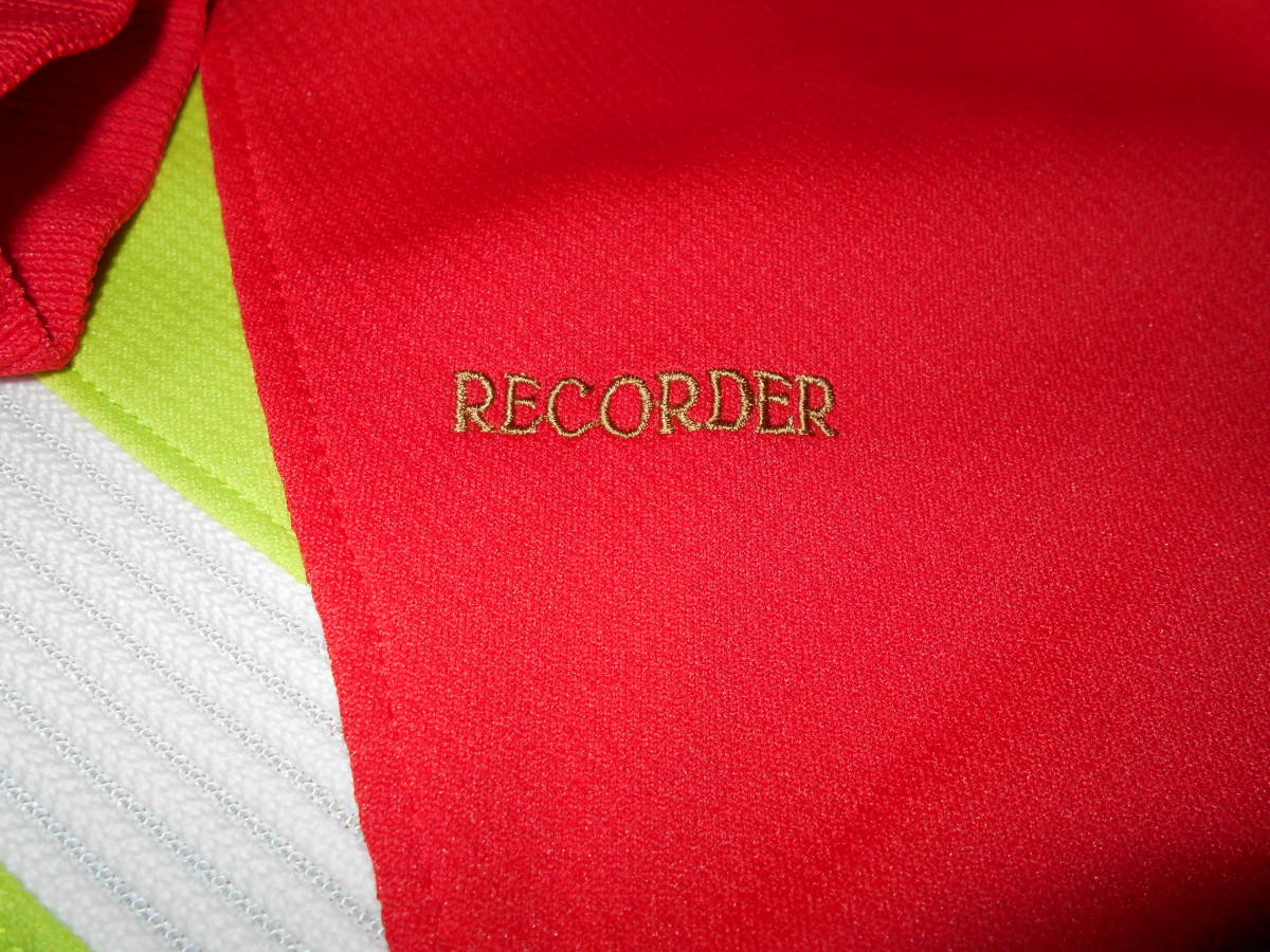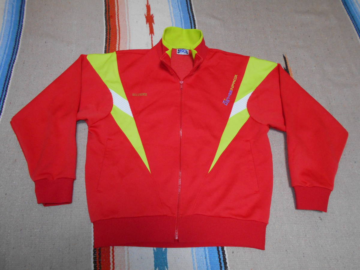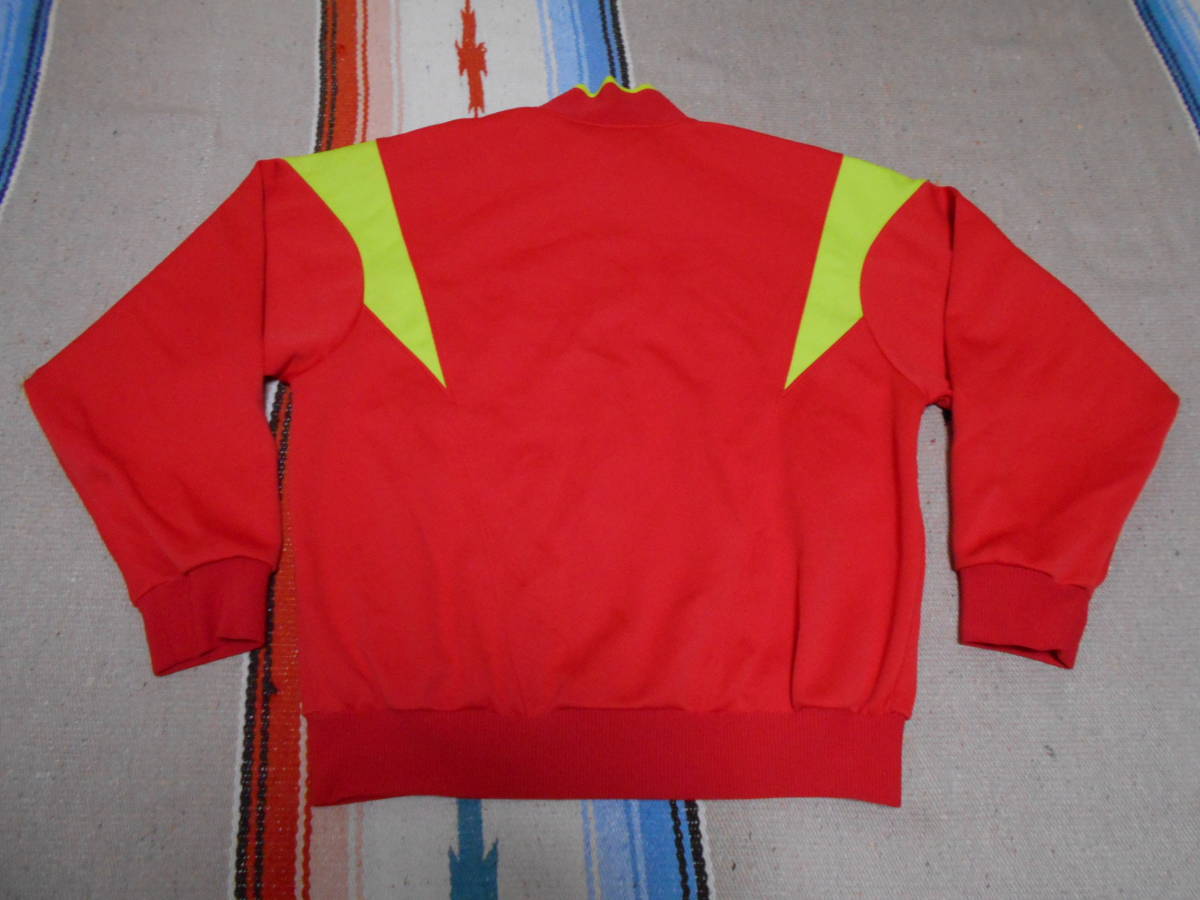 朱赤に映えるネオンイエローの好配色にボディーの V字切り返し縫製、ネックリブのライニングデザイン、ビンテージ物特有の良質ジャージー素材感、ハンドウォーマー、チェストの RECORDER エンブレム刺繍、タイト過ぎない動き易いシルエット  等等等...細部までノスタルジックな風合いの有るジャージー