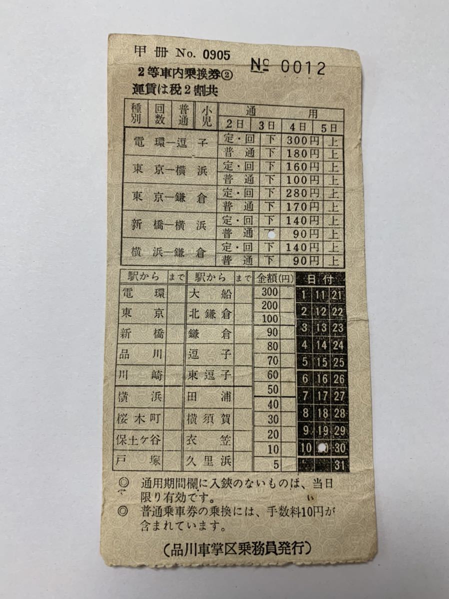 こちらは甲冊 2等車内乗換券 品川車掌区乗務員発行です。