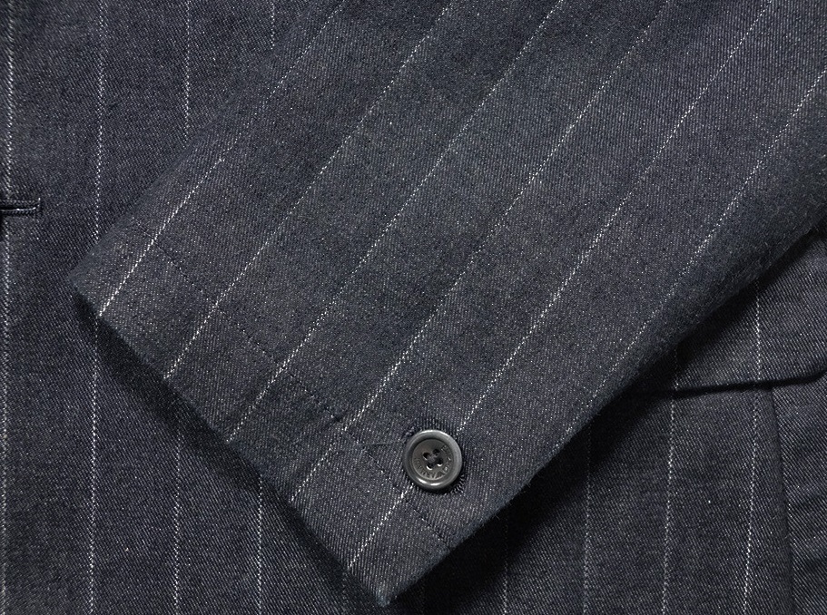 清潔感と高級感を併せ持つインディゴ生地、コットンノッチドラペル、フロント2釦、袖1釦、サイドベンツ、背抜き仕立て