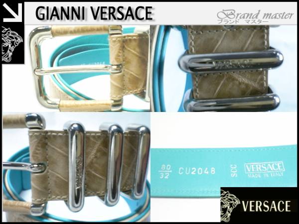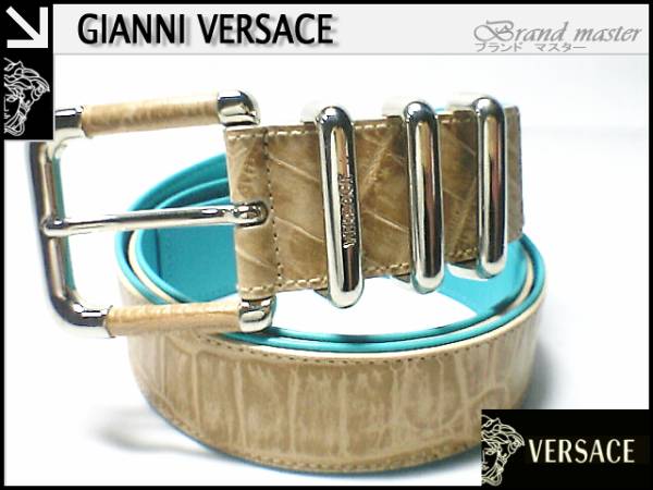 表面は落ち着いたライトブラウンのクロコ型押しデザインとなっており、バックルにはVERSACEの刻印がありベルトループは3連になっています。