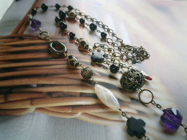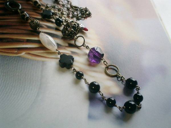 やさしい気持ち・・シリーズです♪ニューヨークの朝・・シックなオニキスのネックレスです♪アンティークモダンな表情でまとめました♪オニキスは6ミリ、8ミリの丸玉、12ミリのクロスです♪モダン柄の天珠やピンクカルセドニーのマーキスや13ミリ、11ミリのラフカットのアメジストやデザインチャームやワイヤーボールを合わせて大人のロマンチックしています♪長さは全長93センチ位で調節自由です♪2連にされても素敵です♪♪シンプルで飽きのこないいつまでも着けられるデザインを考えて作りました!お揃いのブレスレットやピアスや同じテーマの作品も出品しています♪ハンドメイドをご理解頂いてノークレーム、ノーリターンでお願いします