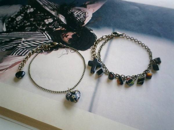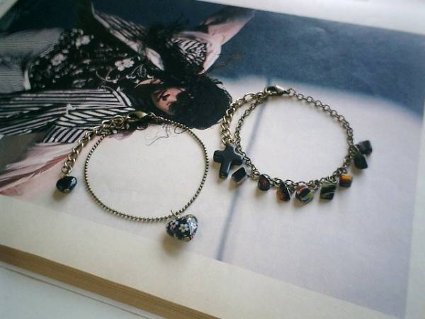 秘めた想い・・シリーズです♪やっぱり花柄が好きです!!黒の花柄のベネチアンビーズとガラスビーズの可憐なブレスレット2本セットです♪左側のブレスレットは華奢なボールチェーンに10ミリの花柄のハートのベネチアンビーズを合わせました♪長さは16センチ+アジャスター5センチで最長21センチ位です♪右側のブレスレットは花柄のガラスビーズのさざれです♪長さは16センチ+アジャスター6センチで最長22センチ位です♪お揃いのネックレスも出品しています♪シンプルで長く着けていただけるデザインを考えて作りました♪♪ハンドメイドをご理解頂いてノークレーム、ノーリターンでお願いします。