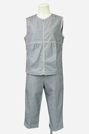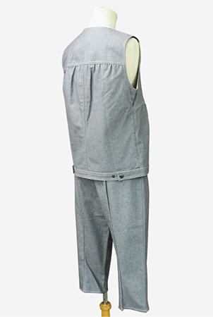 | 特徴 | トップスの替えリベットが付いたグレーのツーピースです。ベストはファスナーで脱ぎ着します。パンツは膝丈。ベストとパンツの組み合わせが、とてもキュートです。ジャケットは、裾のボタンで調節可能。 | ||