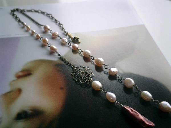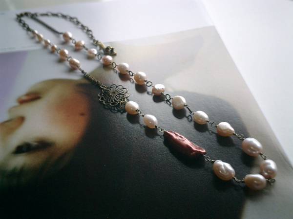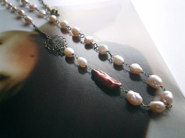 巴里のお針子さん・・シリーズです♪ビロードの猫・・ネオロマンチズムを探して!シックな淡水パールのネックレスです♪さりげなく華やかな素材を合わせてアンティークな雰囲気です♪♪淡いピンクやオレンジの淡水パールは6ミリから9ミリ位までのポテト形やバロック型で大きさ違い、形違いです♪柔らかでやさしい表情です♪アクセントのサテンボルドー色の淡水パールは10×25ミリ位です♪アンティークチャームを合わせてさりげなくロマンチックしています♪長さは全長67センチ位で調節自由です♪チョーカー風にしたりブレスにしても可愛いです♪セットのネックレスやお揃いのブレスレットも出品しています♪シンプルで飽きのこないいつまでも着けられるデザインを考えて作りました!ハンドメイドをご理解頂いてノークレーム、ノーリターンでお願いします