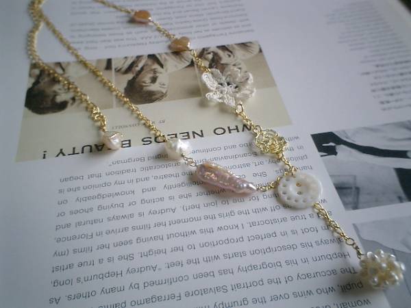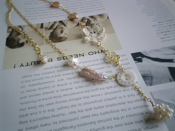 ロマンチックな淡水パールシリーズです♪♪素敵な夢を見て!淡水パールを使ったネックレスシリーズです♪お色違い、形違いの淡水パールを使っていろいろな表情のネックレスを作りました♪それぞれ個性的でシンプルなデザインなので長く着けて頂けると思います♪こちらのデザインはモーヴピンクの22ミリ位のスティック型や10ミリのハートです♪オフホワイトのつぶパールや12ミリ位の淡水パール玉やレース模様のシェルボタンや薔薇のチャームや25ミリくらいの綿レースのお花を合わせて可憐にロマンチックしています♪♪やさしいお色でまとめて大人っぽい可愛さです♪長さは全長58センチ位で調節自由です♪淡水パール玉のトップはチェーンを入れて6センチ位です♪チョーカー風に着けても可愛いです♪シンプルで飽きのこないいつまでも着けられるデザインを考えて作りました!お揃いのシリーズでデザイン違いのネックレスも出品しています。ハンドメイドをご理解頂いてノークレーム、ノーリターンでお願いします