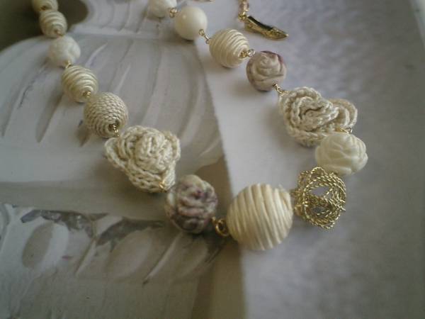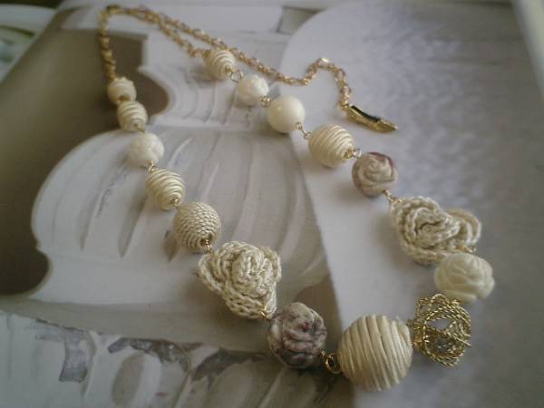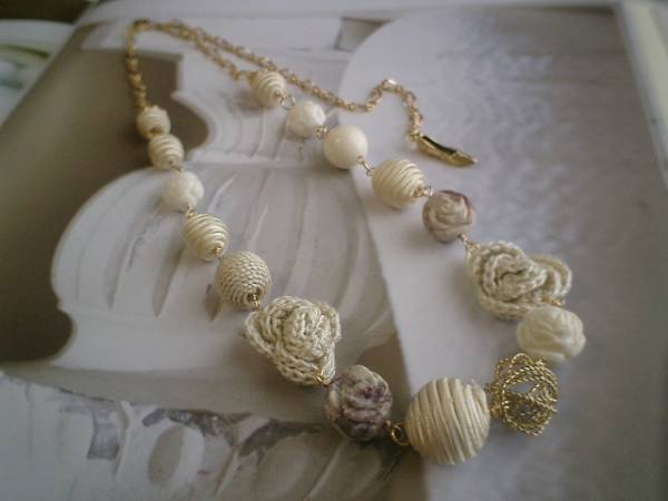 ニューヨークスタイル♪シリーズです!ベーシックでさりげなく遊び心をいれたデザインです♪キュートなネックレスです♪サーモンピンクやベージュ色がアートな表情のジャスパーの薔薇は14ミリから16ミリ位です♪ベージュのサテンボールは10ミリから20ミリ位までの大きさ違いです♪同じベージュ色の麻ボールやオフホワイトの樹脂の薔薇や綿レースの薔薇やワイヤーボールなど個性あふれる素材を集めました♪シックなお色でまとめて大人のロマンチックしています♪色々なお洋服に合わせて楽しんでいただきたいです♪長さは全長68センチ位で調節自由です♪チョーカー風に着けても可愛いです♪シンプルで長く着けて頂けるデザインを考えて作りました♪お揃いのブレスレットも出品しています。ハンドメイドをご理解頂いてノークレーム、ノーリターンでお願いします