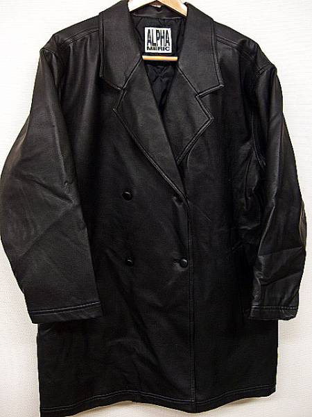 ALPHA MERIC フェイクレザーコートです。色は黒。とても軽量で着用しやすいですよ。◆サイズはMで着丈約82cm・肩幅約52.5cm・袖丈約52cm・身幅約58cmです。◆USEDですが状態は良好です。ベルトループ有りますがベルトは有りません。◆