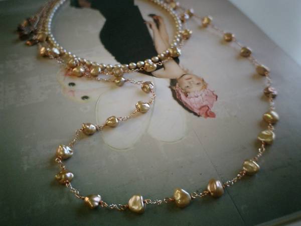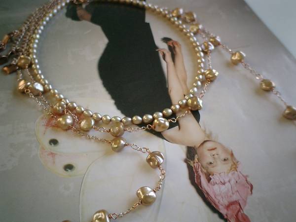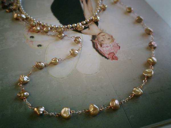 ロマンチックなオートクチュールシリーズです♪♪シックなシャンパンゴールドの淡水パールのネックレス3点セットです♪3本一緒に着けたり2本をネックレスに1本をブレスレットにしたり色々な組み合わせでお楽しみいただけます♪2点は同じ芥子パールの長さ違いです♪繊細なシャンパンゴールドの芥子パールは10ミリ位のバロックです♪ピンクゴールドのチェーンでランダムにつないでやさしい表情のネックレスです♪長い方は91センチ位で調節自由です♪2連にしたりブレスにしても可愛いです♪短い方は全長55センチ位で調節自由です♪チョーカー風にしたりブレスにしても素敵です♪同じシャンパンゴールドの4×6ミリ位のライス型の淡水パールは39センチ+アジャスター12センチで最長51センチ位です♪合わせやすいシンプルなデザインです♪3点とも秋のお洋服に合わせてお楽しみいただきたいです♪それぞれ2本セットや単品でも出品しています♪ハンドメイドをご理解頂いてノークレーム、ノーリターンでお願いします。