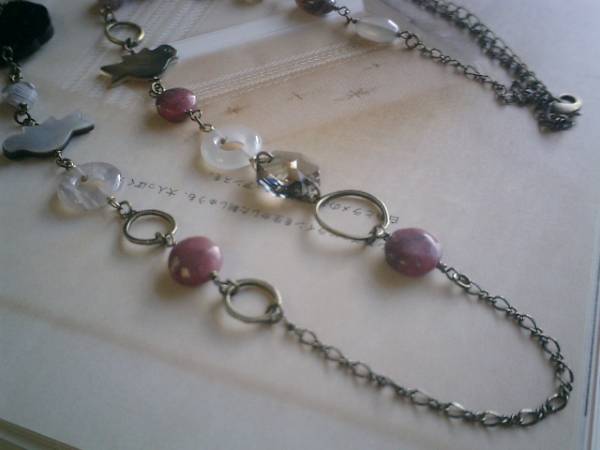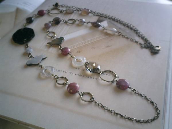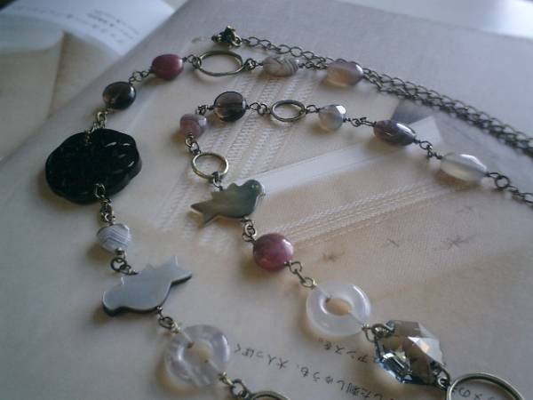 ローマの小鳥さんシリーズです♪大人色でまとめたシックで繊細なネックレスです♪ブラックシェルの小鳥さんは20×15ミリ位です♪シックな模様のボツワナアゲートは8ミリのハートや12×8ミリのオーバルです♪10ミリのコインのロードナイトやスワロの14ミリやカルセドニーのリングや25ミリの黒の透かしパーツやアンティークチャームを合わせて可憐にロマンチックしています♪長さは全長93センチ位で調節自由です♪2連にしたりぐるぐる巻いてブレスレットにしても可愛いです♪シンプルで飽きのこないいつまでも着けられるデザインを考えて作りました!お揃いのブレスレットやイヤリングも出品しています♪ハンドメイドをご理解頂いてノークレーム、ノーリターンでお願いします