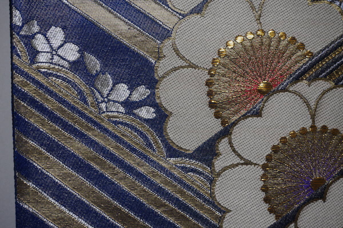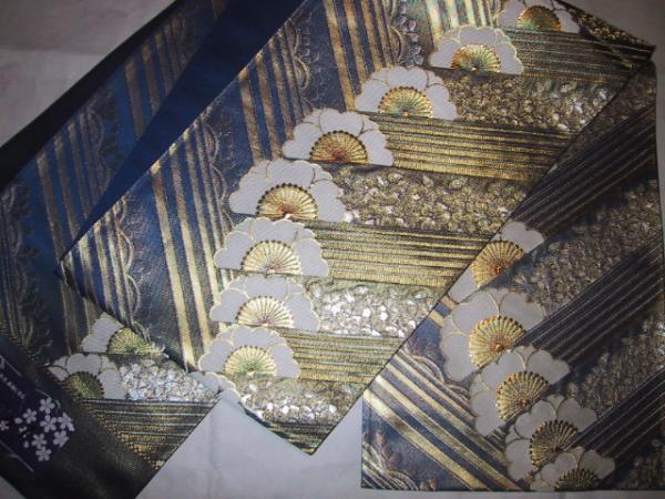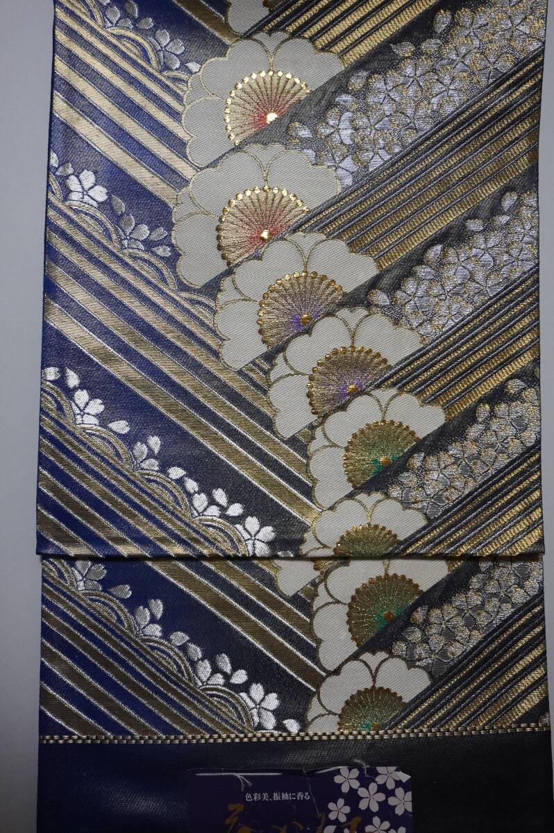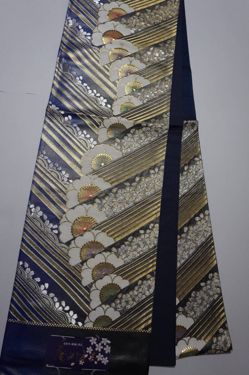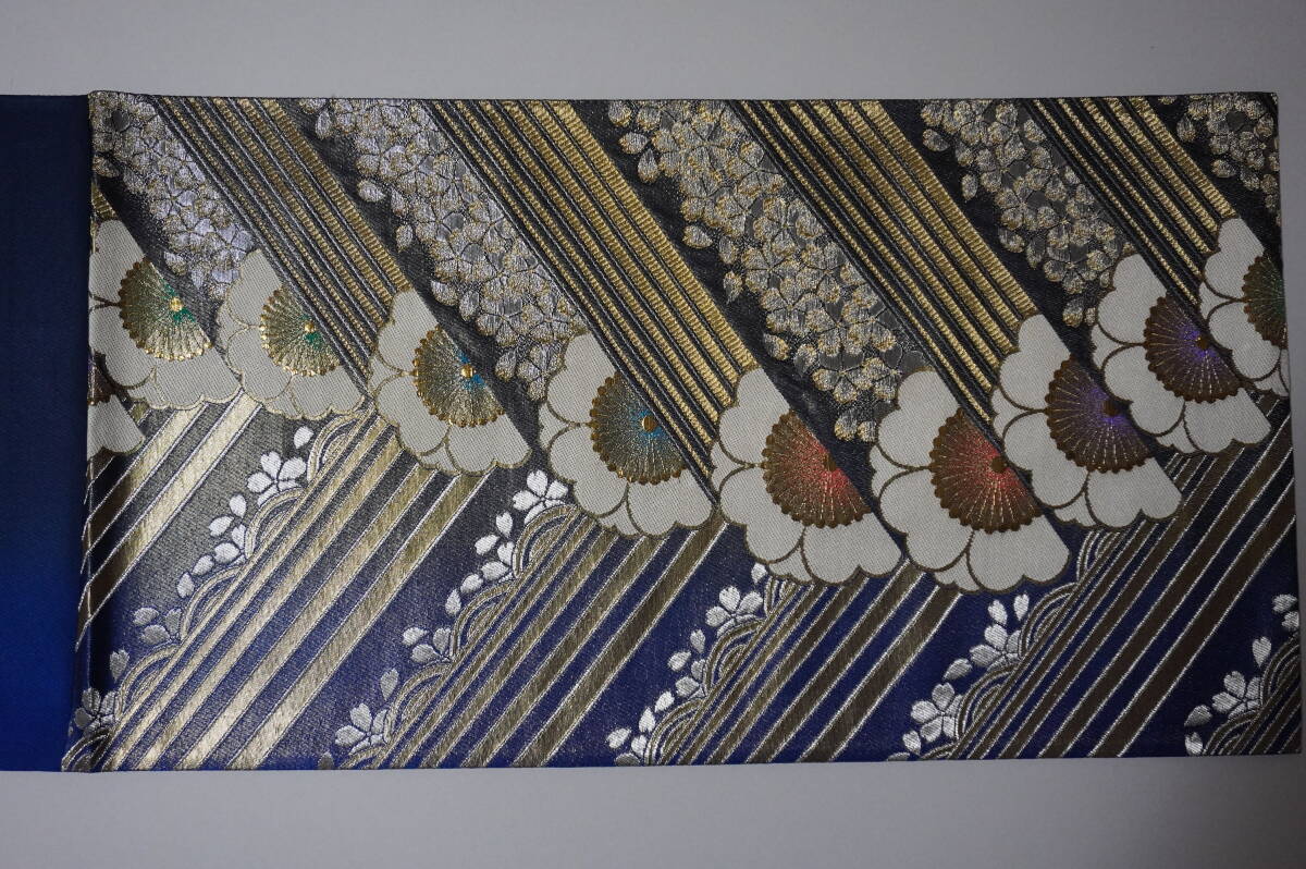 京都西陣 じゅらく の 若向きよう(振袖、訪問着、付け下げ、無地、小紋、など向き)のTOPブランド品『花かるた(花かおり)』ブランドです。6通柄袋帯 新品未仕立て品、絹100%金属糸等使用  青紺~くらめ紺色(裏地くらめ紺)に金色のの生地に線とはな、、、
