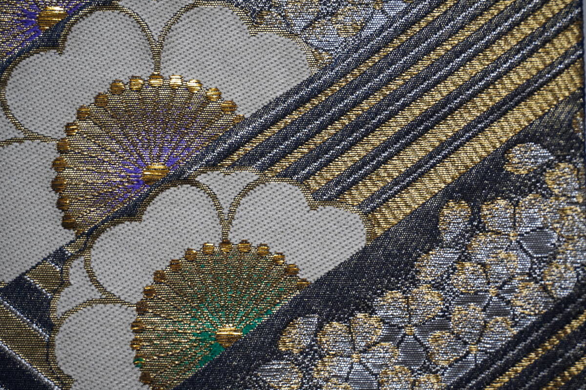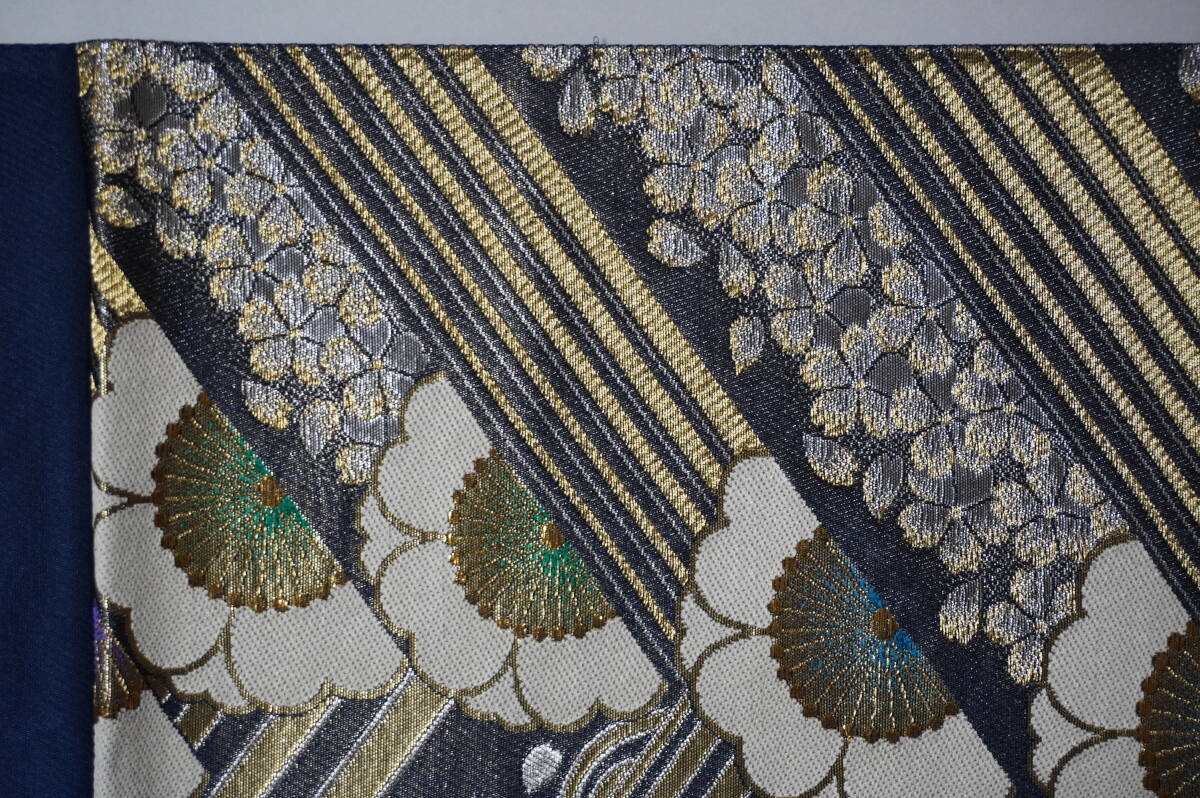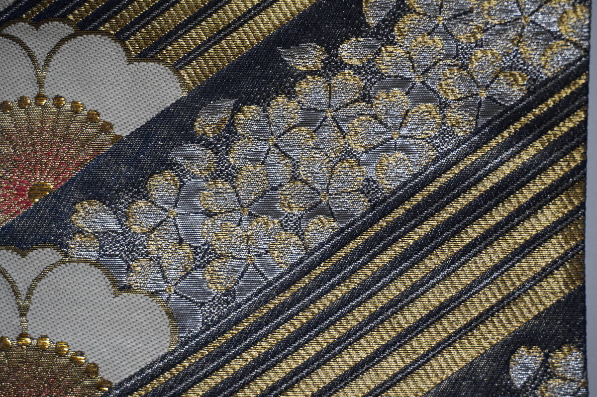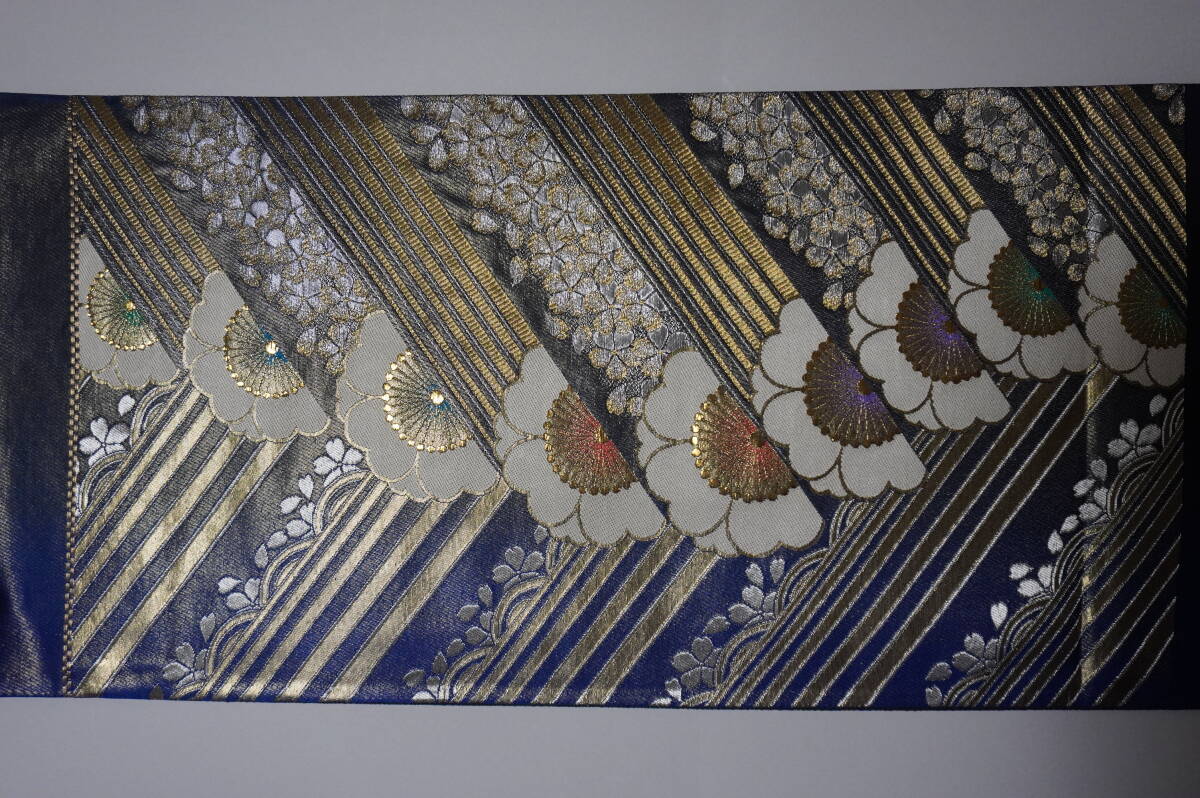 京都西陣 じゅらく の 若向きよう(振袖、訪問着、付け下げ、無地、小紋、など向き)のTOPブランド品『花かるた(花かおり)』ブランドです。6通柄袋帯 新品未仕立て品、絹100%金属糸等使用  青紺~くらめ紺色(裏地くらめ紺)に金色のの生地に線とはな、、、